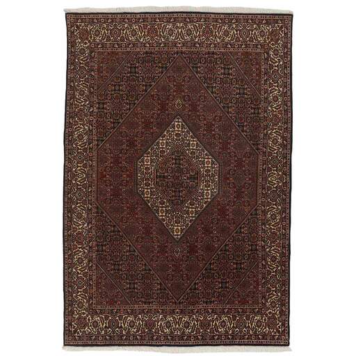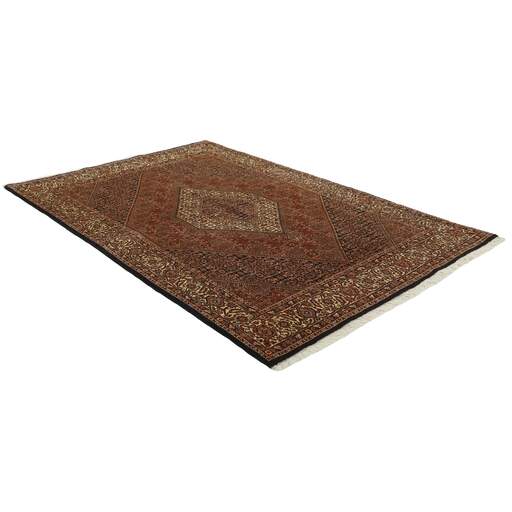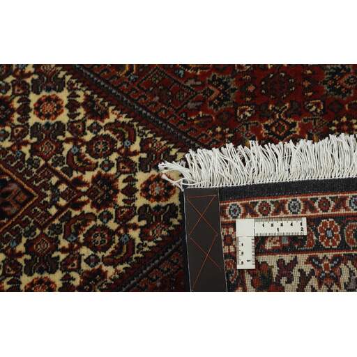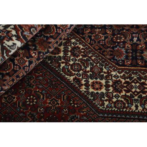 Bidjar est une ville d'environ 50 000 habitants située dans la province du Kurdistan, au nord-ouest du pays. Elle se trouve dans une vallée fertile entourée de montagnes arides et ne possède aucun monument important. La ville sert principalement de centre commercial pour les villages environnants. Son histoire récente est dramatique, car la ville a été occupée d'abord par les Russes, puis par les Turcs, pendant la Première Guerre mondiale, ce qui a entraîné une famine qui a considérablement réduit la population. Ces événements se reflètent dans la production de tapis de la ville. Avant la Première Guerre mondiale, les tapis étaient noués grossièrement mais fermement, avec une chaîne et une trame en laine. Plus tard, ils sont devenus plus fins et avaient des bases en coton. Les motifs Bidjar sont souvent Herati, mais parfois on peut voir un motif Mahi. Les couleurs sont généralement des rouges clairs avec une bordure légère. Les tapis Bidjar sont si fortement noués que vous risquez de casser les nœuds si vous les pliez ensemble avec le poil tourné vers l'intérieur. Lorsque vous pliez les tapis Bidjar, c'est donc toujours avec le poil tourné vers l'extérieur. On sent clairement que la laine utilisée dans un tapis Bidjar est bien plus importante que dans la plupart des autres tapis. Ils sont beaucoup plus lourds et ne sont pas aussi faciles à déplacer lorsqu'ils sont posés sur le sol.