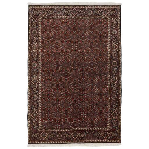 Bidjar est une ville d'environ 50 000 habitants située dans la province du Kurdistan, au nord-ouest du pays. Elle se trouve dans une vallée fertile entourée de montagnes arides et ne possède aucun monument important. La ville sert principalement de centre commercial pour les villages environnants. Son histoire récente est dramatique, car la ville a été occupée d'abord par les Russes, puis par les Turcs, pendant la Première Guerre mondiale, ce qui a entraîné une famine qui a considérablement réduit la population. Ces événements se reflètent dans la production de tapis de la ville. Avant la Première Guerre mondiale, les tapis étaient noués grossièrement mais fermement, avec une chaîne et une trame en laine. Plus tard, ils sont devenus plus fins et avaient des bases en coton. Les motifs Bidjar sont souvent Herati, mais parfois on peut voir un motif Mahi. Les couleurs sont généralement des rouges clairs avec une bordure légère. Les tapis Bidjar sont si fortement noués que vous risquez de casser les nœuds si vous les pliez ensemble avec le poil tourné vers l'intérieur. Lorsque vous pliez les tapis Bidjar, c'est donc toujours avec le poil tourné vers l'extérieur. On sent clairement que la laine utilisée dans un tapis Bidjar est bien plus importante que dans la plupart des autres tapis. Ils sont beaucoup plus lourds et ne sont pas aussi faciles à déplacer lorsqu'ils sont posés sur le sol.