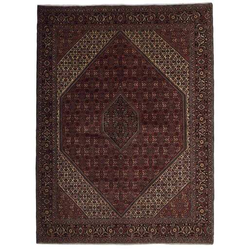 Bidjar est une ville d'environ 50 000 habitants située dans la province du Kurdistan, au nord-ouest du pays. Elle se trouve dans une vallée fertile entourée de montagnes arides et ne possède aucun monument important. La ville sert principalement de centre commercial pour les villages environnants. Son histoire récente est dramatique, car la ville a été occupée d'abord par les Russes, puis par les Turcs, pendant la Première Guerre mondiale, ce qui a entraîné une famine qui a considérablement réduit la population. Ces événements se reflètent dans la production de tapis de la ville. Avant la Première Guerre mondiale, les tapis étaient noués grossièrement mais fermement, avec une chaîne et une trame en laine. Plus tard, ils sont devenus plus fins et avaient des bases en coton. Les motifs Bidjar sont souvent Herati, mais parfois on peut voir un motif Mahi. Les couleurs sont généralement des rouges clairs avec une bordure légère. Les tapis Bidjar sont si fortement noués que vous risquez de casser les nœuds si vous les pliez ensemble avec le poil tourné vers l'intérieur. Lorsque vous pliez les tapis Bidjar, c'est donc toujours avec le poil tourné vers l'extérieur. On sent clairement que la laine utilisée dans un tapis Bidjar est bien plus importante que dans la plupart des autres tapis. Ils sont beaucoup plus lourds et ne sont pas aussi faciles à déplacer lorsqu'ils sont posés sur le sol.