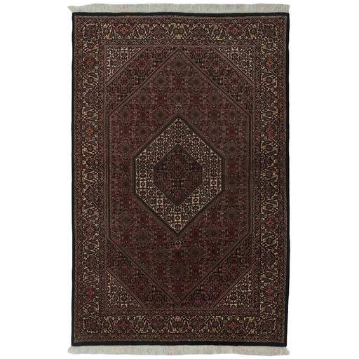 Bidjar est une ville d'environ 50 000 habitants située dans la province du Kurdistan, au nord-ouest du pays. Elle se trouve dans une vallée fertile entourée de montagnes arides et ne possède aucun monument important. La ville sert principalement de centre commercial pour les villages environnants. Son histoire récente est dramatique, car la ville a été occupée d'abord par les Russes, puis par les Turcs, pendant la Première Guerre mondiale, ce qui a entraîné une famine qui a considérablement réduit la population. Ces événements se reflètent dans la production de tapis de la ville. Avant la Première Guerre mondiale, les tapis étaient noués grossièrement mais fermement, avec une chaîne et une trame en laine. Plus tard, ils sont devenus plus fins et avaient des bases en coton. Les motifs Bidjar sont souvent Herati, mais parfois on peut voir un motif Mahi. Les couleurs sont généralement des rouges clairs avec une bordure légère. Les tapis Bidjar sont si fortement noués que vous risquez de casser les nœuds si vous les pliez ensemble avec le poil tourné vers l'intérieur. Lorsque vous pliez les tapis Bidjar, c'est donc toujours avec le poil tourné vers l'extérieur. On sent clairement que la laine utilisée dans un tapis Bidjar est bien plus importante que dans la plupart des autres tapis. Ils sont beaucoup plus lourds et ne sont pas aussi faciles à déplacer lorsqu'ils sont posés sur le sol.