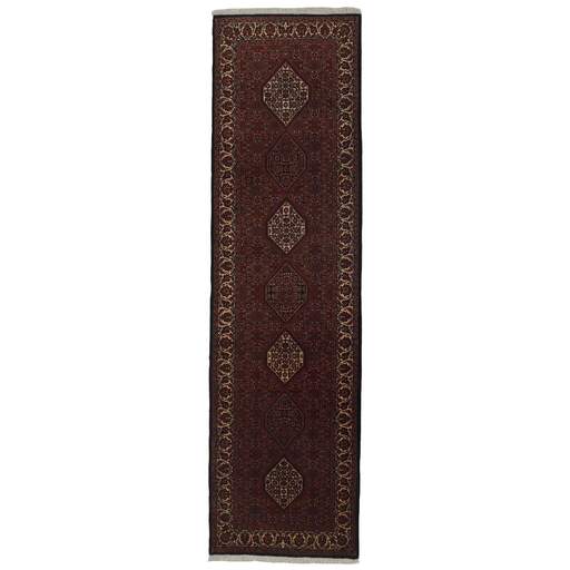 Bidjar est une ville d'environ 50 000 habitants située dans la province du Kurdistan, au nord-ouest du pays. Elle se trouve dans une vallée fertile entourée de montagnes arides et ne possède aucun monument important. La ville sert principalement de centre commercial pour les villages environnants. Son histoire récente est dramatique, car la ville a été occupée d'abord par les Russes, puis par les Turcs, pendant la Première Guerre mondiale, ce qui a entraîné une famine qui a considérablement réduit la population. Ces événements se reflètent dans la production de tapis de la ville. Avant la Première Guerre mondiale, les tapis étaient noués grossièrement mais fermement, avec une chaîne et une trame en laine. Plus tard, ils sont devenus plus fins et avaient des bases en coton. Les motifs Bidjar sont souvent Herati, mais parfois on peut voir un motif Mahi. Les couleurs sont généralement des rouges clairs avec une bordure légère. Les tapis Bidjar sont si fortement noués que vous risquez de casser les nœuds si vous les pliez ensemble avec le poil tourné vers l'intérieur. Lorsque vous pliez les tapis Bidjar, c'est donc toujours avec le poil tourné vers l'extérieur. On sent clairement que la laine utilisée dans un tapis Bidjar est bien plus importante que dans la plupart des autres tapis. Ils sont beaucoup plus lourds et ne sont pas aussi faciles à déplacer lorsqu'ils sont posés sur le sol.