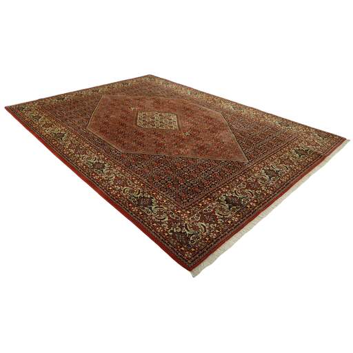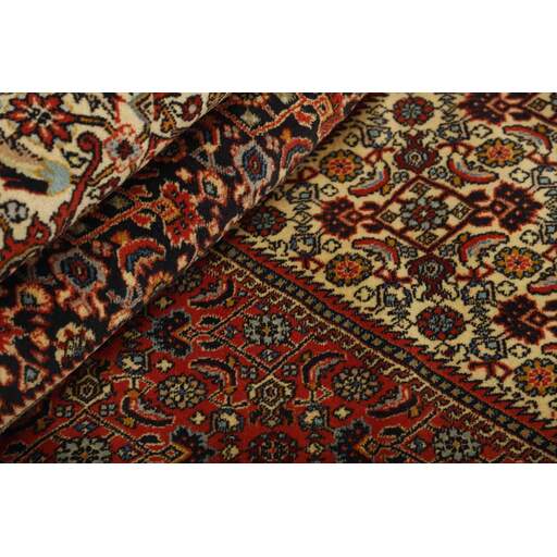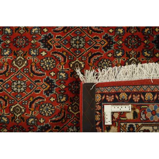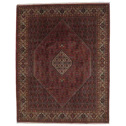 Bidjar est une ville d'environ 50 000 habitants située dans la province du Kurdistan, au nord-ouest du pays. Elle se trouve dans une vallée fertile entourée de montagnes arides et ne possède aucun monument important. La ville sert principalement de centre commercial pour les villages environnants. Son histoire récente est dramatique, car la ville a été occupée d'abord par les Russes, puis par les Turcs, pendant la Première Guerre mondiale, ce qui a entraîné une famine qui a considérablement réduit la population. Ces événements se reflètent dans la production de tapis de la ville. Avant la Première Guerre mondiale, les tapis étaient noués grossièrement mais fermement, avec une chaîne et une trame en laine. Plus tard, ils sont devenus plus fins et avaient des bases en coton. Les motifs Bidjar sont souvent Herati, mais parfois on peut voir un motif Mahi. Les couleurs sont généralement des rouges clairs avec une bordure légère. Les tapis Bidjar sont si fortement noués que vous risquez de casser les nœuds si vous les pliez ensemble avec le poil tourné vers l'intérieur. Lorsque vous pliez les tapis Bidjar, c'est donc toujours avec le poil tourné vers l'extérieur. On sent clairement que la laine utilisée dans un tapis Bidjar est bien plus importante que dans la plupart des autres tapis. Ils sont beaucoup plus lourds et ne sont pas aussi faciles à déplacer lorsqu'ils sont posés sur le sol.