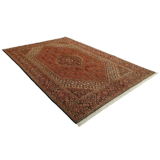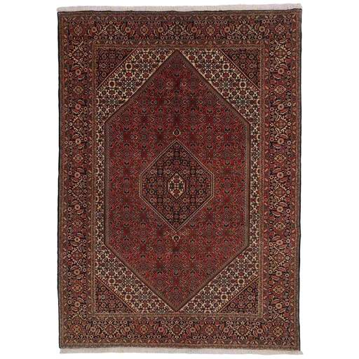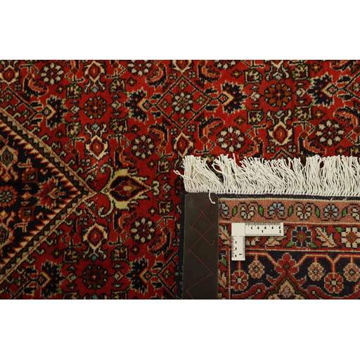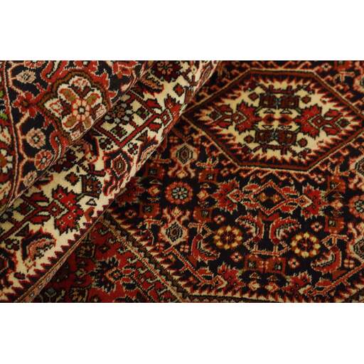 Bidjar est une ville d'environ 50 000 habitants située dans la province du Kurdistan, au nord-ouest du pays. Elle se trouve dans une vallée fertile entourée de montagnes arides et ne possède aucun monument important. La ville sert principalement de centre commercial pour les villages environnants. Son histoire récente est dramatique, car la ville a été occupée d'abord par les Russes, puis par les Turcs, pendant la Première Guerre mondiale, ce qui a entraîné une famine qui a considérablement réduit la population. Ces événements se reflètent dans la production de tapis de la ville. Avant la Première Guerre mondiale, les tapis étaient noués grossièrement mais fermement, avec une chaîne et une trame en laine. Plus tard, ils sont devenus plus fins et avaient des bases en coton. Les motifs Bidjar sont souvent Herati, mais parfois on peut voir un motif Mahi. Les couleurs sont généralement des rouges clairs avec une bordure légère. Les tapis Bidjar sont si fortement noués que vous risquez de casser les nœuds si vous les pliez ensemble avec le poil tourné vers l'intérieur. Lorsque vous pliez les tapis Bidjar, c'est donc toujours avec le poil tourné vers l'extérieur. On sent clairement que la laine utilisée dans un tapis Bidjar est bien plus importante que dans la plupart des autres tapis. Ils sont beaucoup plus lourds et ne sont pas aussi faciles à déplacer lorsqu'ils sont posés sur le sol.