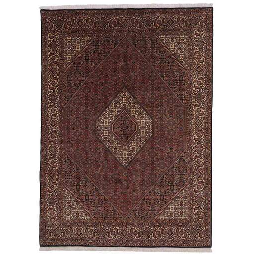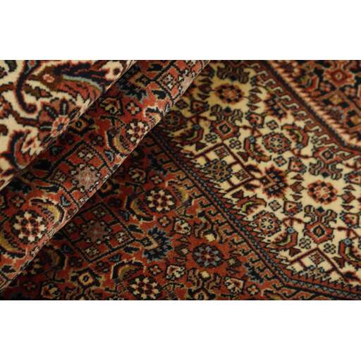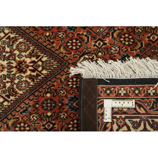 Bidjar est une ville d'environ 50 000 habitants située dans la province du Kurdistan, au nord-ouest du pays. Elle se trouve dans une vallée fertile entourée de montagnes arides et ne possède aucun monument important. La ville sert principalement de centre commercial pour les villages environnants. Son histoire récente est dramatique, car la ville a été occupée d'abord par les Russes, puis par les Turcs, pendant la Première Guerre mondiale, ce qui a entraîné une famine qui a considérablement réduit la population. Ces événements se reflètent dans la production de tapis de la ville. Avant la Première Guerre mondiale, les tapis étaient noués grossièrement mais fermement, avec une chaîne et une trame en laine. Plus tard, ils sont devenus plus fins et avaient des bases en coton. Les motifs Bidjar sont souvent Herati, mais parfois on peut voir un motif Mahi. Les couleurs sont généralement des rouges clairs avec une bordure légère. Les tapis Bidjar sont si fortement noués que vous risquez de casser les nœuds si vous les pliez ensemble avec le poil tourné vers l'intérieur. Lorsque vous pliez les tapis Bidjar, c'est donc toujours avec le poil tourné vers l'extérieur. On sent clairement que la laine utilisée dans un tapis Bidjar est bien plus importante que dans la plupart des autres tapis. Ils sont beaucoup plus lourds et ne sont pas aussi faciles à déplacer lorsqu'ils sont posés sur le sol.