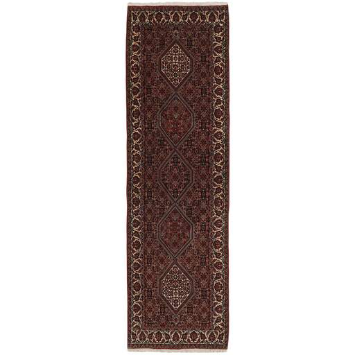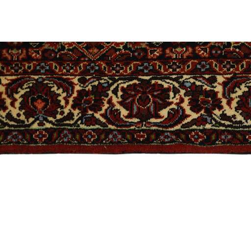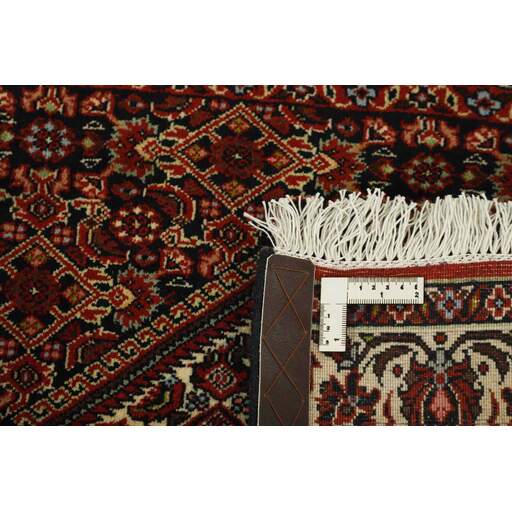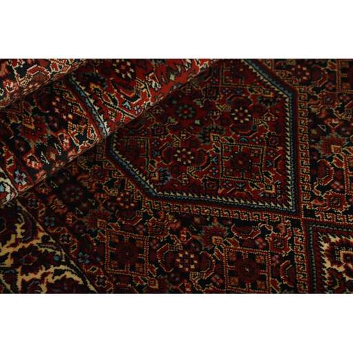 Bidjar est une ville d'environ 50 000 habitants située dans la province du Kurdistan, au nord-ouest du pays. Elle se trouve dans une vallée fertile entourée de montagnes arides et ne possède aucun monument important. La ville sert principalement de centre commercial pour les villages environnants. Son histoire récente est dramatique, car la ville a été occupée d'abord par les Russes, puis par les Turcs, pendant la Première Guerre mondiale, ce qui a entraîné une famine qui a considérablement réduit la population. Ces événements se reflètent dans la production de tapis de la ville. Avant la Première Guerre mondiale, les tapis étaient noués grossièrement mais fermement, avec une chaîne et une trame en laine. Plus tard, ils sont devenus plus fins et avaient des bases en coton. Les motifs Bidjar sont souvent Herati, mais parfois on peut voir un motif Mahi. Les couleurs sont généralement des rouges clairs avec une bordure légère. Les tapis Bidjar sont si fortement noués que vous risquez de casser les nœuds si vous les pliez ensemble avec le poil tourné vers l'intérieur. Lorsque vous pliez les tapis Bidjar, c'est donc toujours avec le poil tourné vers l'extérieur. On sent clairement que la laine utilisée dans un tapis Bidjar est bien plus importante que dans la plupart des autres tapis. Ils sont beaucoup plus lourds et ne sont pas aussi faciles à déplacer lorsqu'ils sont posés sur le sol.