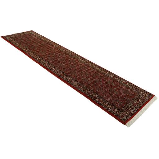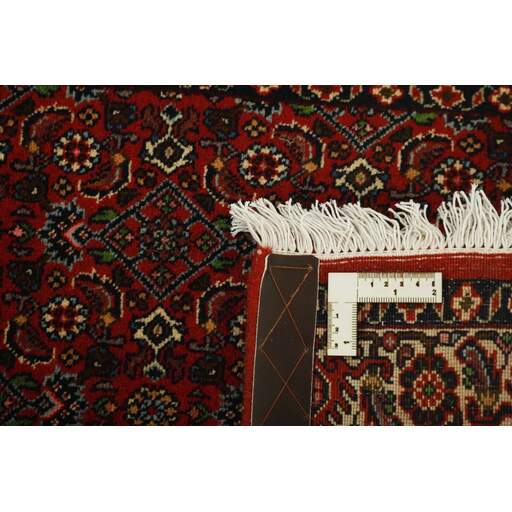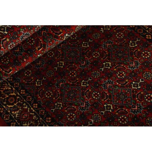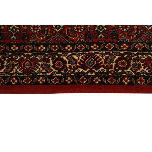 Bidjar est une ville d'environ 50 000 habitants située dans la province du Kurdistan, au nord-ouest du pays. Elle se trouve dans une vallée fertile entourée de montagnes arides et ne possède aucun monument important. La ville sert principalement de centre commercial pour les villages environnants. Son histoire récente est dramatique, car la ville a été occupée d'abord par les Russes, puis par les Turcs, pendant la Première Guerre mondiale, ce qui a entraîné une famine qui a considérablement réduit la population. Ces événements se reflètent dans la production de tapis de la ville. Avant la Première Guerre mondiale, les tapis étaient noués grossièrement mais fermement, avec une chaîne et une trame en laine. Plus tard, ils sont devenus plus fins et avaient des bases en coton. Les motifs Bidjar sont souvent Herati, mais parfois on peut voir un motif Mahi. Les couleurs sont généralement des rouges clairs avec une bordure légère. Les tapis Bidjar sont si fortement noués que vous risquez de casser les nœuds si vous les pliez ensemble avec le poil tourné vers l'intérieur. Lorsque vous pliez les tapis Bidjar, c'est donc toujours avec le poil tourné vers l'extérieur. On sent clairement que la laine utilisée dans un tapis Bidjar est bien plus importante que dans la plupart des autres tapis. Ils sont beaucoup plus lourds et ne sont pas aussi faciles à déplacer lorsqu'ils sont posés sur le sol.