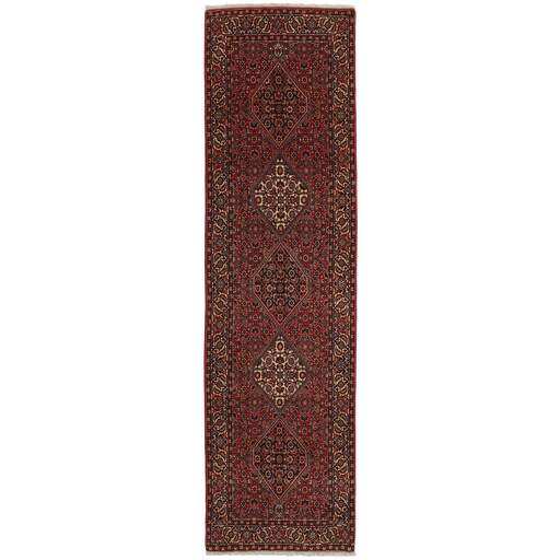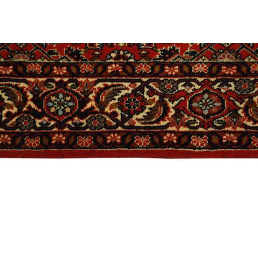 Bidjar est une ville d'environ 50 000 habitants située dans la province du Kurdistan, au nord-ouest du pays. Elle se trouve dans une vallée fertile entourée de montagnes arides et ne possède aucun monument important. La ville sert principalement de centre commercial pour les villages environnants. Son histoire récente est dramatique, car la ville a été occupée d'abord par les Russes, puis par les Turcs, pendant la Première Guerre mondiale, ce qui a entraîné une famine qui a considérablement réduit la population. Ces événements se reflètent dans la production de tapis de la ville. Avant la Première Guerre mondiale, les tapis étaient noués grossièrement mais fermement, avec une chaîne et une trame en laine. Plus tard, ils sont devenus plus fins et avaient des bases en coton. Les motifs Bidjar sont souvent Herati, mais parfois on peut voir un motif Mahi. Les couleurs sont généralement des rouges clairs avec une bordure légère. Les tapis Bidjar sont si fortement noués que vous risquez de casser les nœuds si vous les pliez ensemble avec le poil tourné vers l'intérieur. Lorsque vous pliez les tapis Bidjar, c'est donc toujours avec le poil tourné vers l'extérieur. On sent clairement que la laine utilisée dans un tapis Bidjar est bien plus importante que dans la plupart des autres tapis. Ils sont beaucoup plus lourds et ne sont pas aussi faciles à déplacer lorsqu'ils sont posés sur le sol.