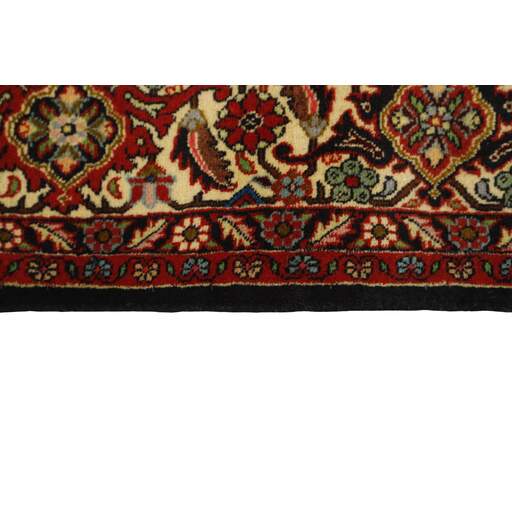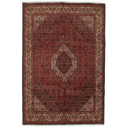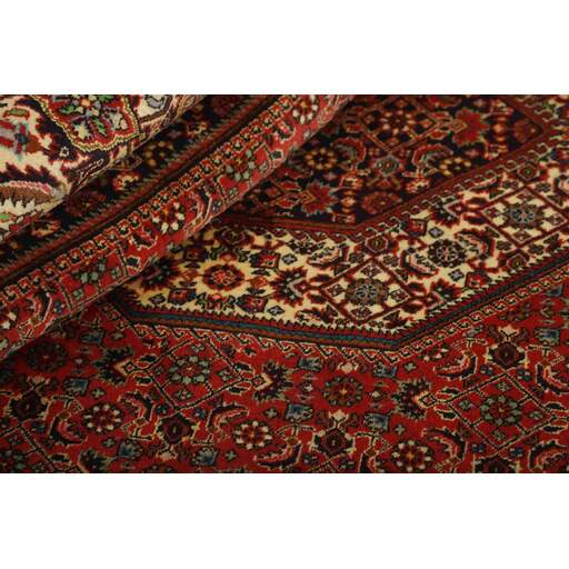 Bidjar est une ville d'environ 50 000 habitants située dans la province du Kurdistan, au nord-ouest du pays. Elle se trouve dans une vallée fertile entourée de montagnes arides et ne possède aucun monument important. La ville sert principalement de centre commercial pour les villages environnants. Son histoire récente est dramatique, car la ville a été occupée d'abord par les Russes, puis par les Turcs, pendant la Première Guerre mondiale, ce qui a entraîné une famine qui a considérablement réduit la population. Ces événements se reflètent dans la production de tapis de la ville. Avant la Première Guerre mondiale, les tapis étaient noués grossièrement mais fermement, avec une chaîne et une trame en laine. Plus tard, ils sont devenus plus fins et avaient des bases en coton. Les motifs Bidjar sont souvent Herati, mais parfois on peut voir un motif Mahi. Les couleurs sont généralement des rouges clairs avec une bordure légère. Les tapis Bidjar sont si fortement noués que vous risquez de casser les nœuds si vous les pliez ensemble avec le poil tourné vers l'intérieur. Lorsque vous pliez les tapis Bidjar, c'est donc toujours avec le poil tourné vers l'extérieur. On sent clairement que la laine utilisée dans un tapis Bidjar est bien plus importante que dans la plupart des autres tapis. Ils sont beaucoup plus lourds et ne sont pas aussi faciles à déplacer lorsqu'ils sont posés sur le sol.