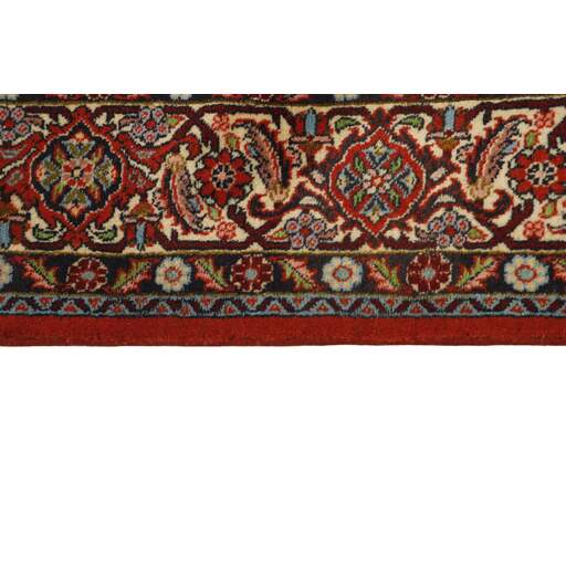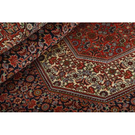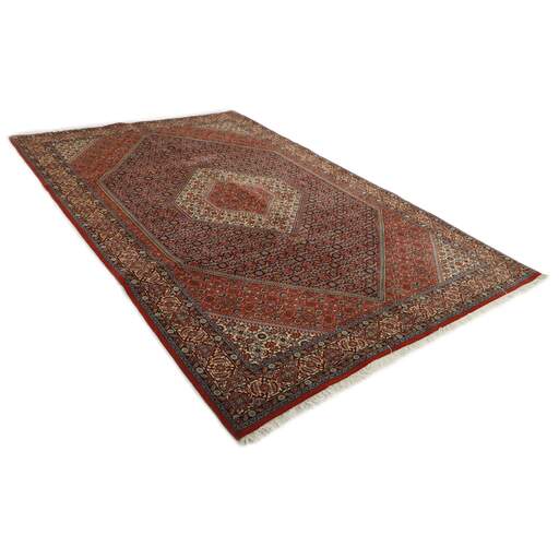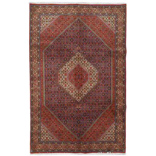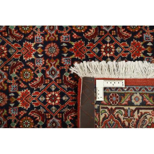 Bidjar est une ville d'environ 50 000 habitants située dans la province du Kurdistan, au nord-ouest du pays. Elle se trouve dans une vallée fertile entourée de montagnes arides et ne possède aucun monument important. La ville sert principalement de centre commercial pour les villages environnants. Son histoire récente est dramatique, car la ville a été occupée d'abord par les Russes, puis par les Turcs, pendant la Première Guerre mondiale, ce qui a entraîné une famine qui a considérablement réduit la population. Ces événements se reflètent dans la production de tapis de la ville. Avant la Première Guerre mondiale, les tapis étaient noués grossièrement mais fermement, avec une chaîne et une trame en laine. Plus tard, ils sont devenus plus fins et avaient des bases en coton. Les motifs Bidjar sont souvent Herati, mais parfois on peut voir un motif Mahi. Les couleurs sont généralement des rouges clairs avec une bordure légère. Les tapis Bidjar sont si fortement noués que vous risquez de casser les nœuds si vous les pliez ensemble avec le poil tourné vers l'intérieur. Lorsque vous pliez les tapis Bidjar, c'est donc toujours avec le poil tourné vers l'extérieur. On sent clairement que la laine utilisée dans un tapis Bidjar est bien plus importante que dans la plupart des autres tapis. Ils sont beaucoup plus lourds et ne sont pas aussi faciles à déplacer lorsqu'ils sont posés sur le sol.