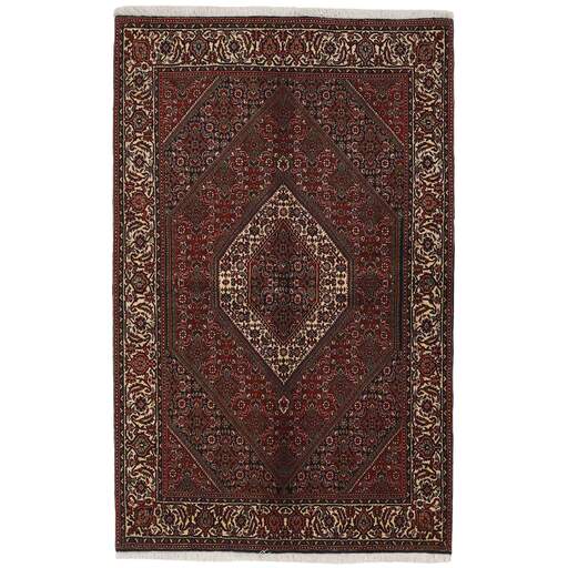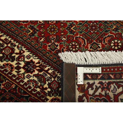 Bidjar est une ville d'environ 50 000 habitants située dans la province du Kurdistan, au nord-ouest du pays. Elle se trouve dans une vallée fertile entourée de montagnes arides et ne possède aucun monument important. La ville sert principalement de centre commercial pour les villages environnants. Son histoire récente est dramatique, car la ville a été occupée d'abord par les Russes, puis par les Turcs, pendant la Première Guerre mondiale, ce qui a entraîné une famine qui a considérablement réduit la population. Ces événements se reflètent dans la production de tapis de la ville. Avant la Première Guerre mondiale, les tapis étaient noués grossièrement mais fermement, avec une chaîne et une trame en laine. Plus tard, ils sont devenus plus fins et avaient des bases en coton. Les motifs Bidjar sont souvent Herati, mais parfois on peut voir un motif Mahi. Les couleurs sont généralement des rouges clairs avec une bordure légère. Les tapis Bidjar sont si fortement noués que vous risquez de casser les nœuds si vous les pliez ensemble avec le poil tourné vers l'intérieur. Lorsque vous pliez les tapis Bidjar, c'est donc toujours avec le poil tourné vers l'extérieur. On sent clairement que la laine utilisée dans un tapis Bidjar est bien plus importante que dans la plupart des autres tapis. Ils sont beaucoup plus lourds et ne sont pas aussi faciles à déplacer lorsqu'ils sont posés sur le sol.