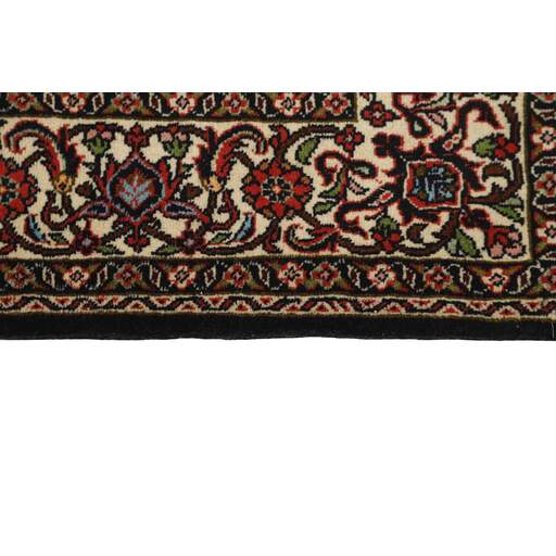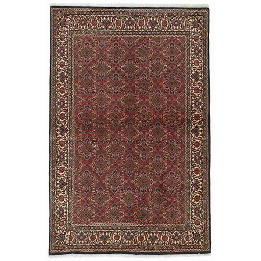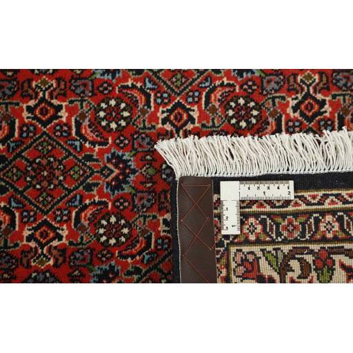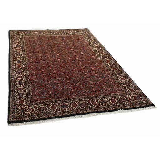 Bidjar est une ville d'environ 50 000 habitants située dans la province du Kurdistan, au nord-ouest du pays. Elle se trouve dans une vallée fertile entourée de montagnes arides et ne possède aucun monument important. La ville sert principalement de centre commercial pour les villages environnants. Son histoire récente est dramatique, car la ville a été occupée d'abord par les Russes, puis par les Turcs, pendant la Première Guerre mondiale, ce qui a entraîné une famine qui a considérablement réduit la population. Ces événements se reflètent dans la production de tapis de la ville. Avant la Première Guerre mondiale, les tapis étaient noués grossièrement mais fermement, avec une chaîne et une trame en laine. Plus tard, ils sont devenus plus fins et avaient des bases en coton. Les motifs Bidjar sont souvent Herati, mais parfois on peut voir un motif Mahi. Les couleurs sont généralement des rouges clairs avec une bordure légère. Les tapis Bidjar sont si fortement noués que vous risquez de casser les nœuds si vous les pliez ensemble avec le poil tourné vers l'intérieur. Lorsque vous pliez les tapis Bidjar, c'est donc toujours avec le poil tourné vers l'extérieur. On sent clairement que la laine utilisée dans un tapis Bidjar est bien plus importante que dans la plupart des autres tapis. Ils sont beaucoup plus lourds et ne sont pas aussi faciles à déplacer lorsqu'ils sont posés sur le sol.