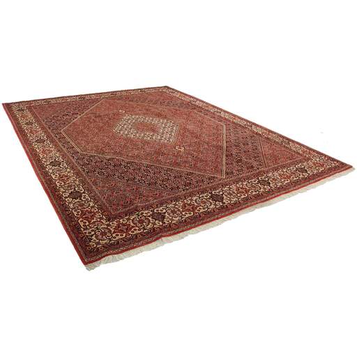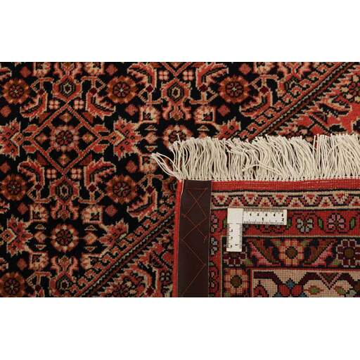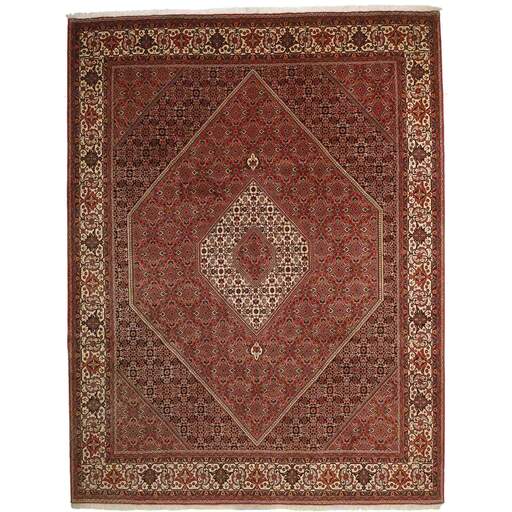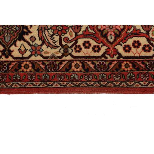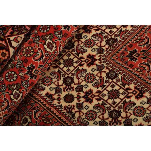Bidjar est une ville d'environ 50 000 habitants située dans la province du Kurdistan, au nord-ouest du pays. Elle se trouve dans une vallée fertile entourée de montagnes arides et ne possède aucun monument important. La ville sert principalement de centre commercial pour les villages environnants. Son histoire récente est dramatique, car la ville a été occupée d'abord par les Russes, puis par les Turcs, pendant la Première Guerre mondiale, ce qui a entraîné une famine qui a considérablement réduit la population. Ces événements se reflètent dans la production de tapis de la ville. Avant la Première Guerre mondiale, les tapis étaient noués grossièrement mais fermement, avec une chaîne et une trame en laine. Plus tard, ils sont devenus plus fins et avaient des bases en coton. Les motifs Bidjar sont souvent Herati, mais parfois on peut voir un motif Mahi. Les couleurs sont généralement des rouges clairs avec une bordure légère. Les tapis Bidjar sont si fortement noués que vous risquez de casser les nœuds si vous les pliez ensemble avec le poil tourné vers l'intérieur. Lorsque vous pliez les tapis Bidjar, c'est donc toujours avec le poil tourné vers l'extérieur. On sent clairement que la laine utilisée dans un tapis Bidjar est bien plus importante que dans la plupart des autres tapis. Ils sont beaucoup plus lourds et ne sont pas aussi faciles à déplacer lorsqu'ils sont posés sur le sol.