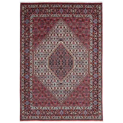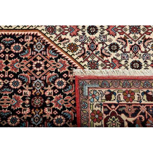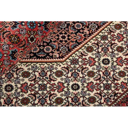 Bidjar est une ville d'environ 50 000 habitants située dans la province du Kurdistan, au nord-ouest du pays. Elle se trouve dans une vallée fertile entourée de montagnes arides et ne possède aucun monument important. La ville sert principalement de centre commercial pour les villages environnants. Son histoire récente est dramatique, car la ville a été occupée d'abord par les Russes, puis par les Turcs, pendant la Première Guerre mondiale, ce qui a entraîné une famine qui a considérablement réduit la population. Ces événements se reflètent dans la production de tapis de la ville. Avant la Première Guerre mondiale, les tapis étaient noués grossièrement mais fermement, avec une chaîne et une trame en laine. Plus tard, ils sont devenus plus fins et avaient des bases en coton. Les motifs Bidjar sont souvent Herati, mais parfois on peut voir un motif Mahi. Les couleurs sont généralement des rouges clairs avec une bordure légère. Les tapis Bidjar sont si fortement noués que vous risquez de casser les nœuds si vous les pliez ensemble avec le poil tourné vers l'intérieur. Lorsque vous pliez les tapis Bidjar, c'est donc toujours avec le poil tourné vers l'extérieur. On sent clairement que la laine utilisée dans un tapis Bidjar est bien plus importante que dans la plupart des autres tapis. Ils sont beaucoup plus lourds et ne sont pas aussi faciles à déplacer lorsqu'ils sont posés sur le sol.