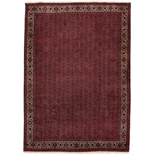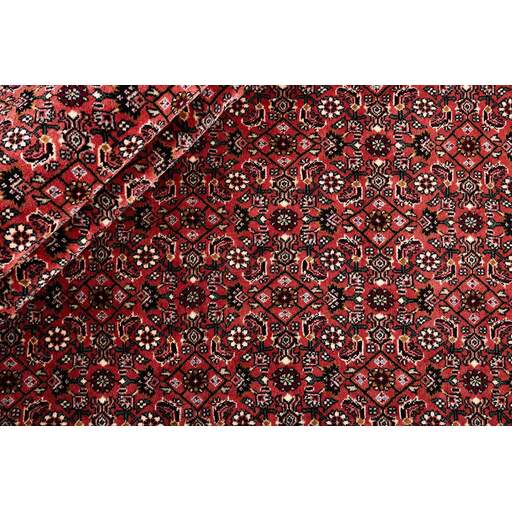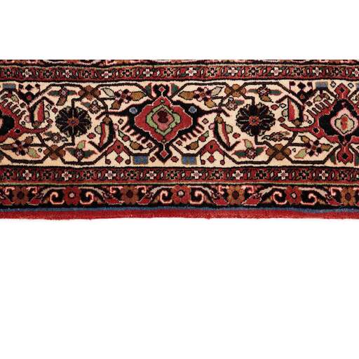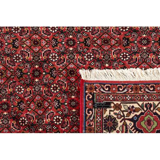 Bidjar est une ville d'environ 50 000 habitants située dans la province du Kurdistan, au nord-ouest du pays. Elle se trouve dans une vallée fertile entourée de montagnes arides et ne possède aucun monument important. La ville sert principalement de centre commercial pour les villages environnants. Son histoire récente est dramatique, car la ville a été occupée d'abord par les Russes, puis par les Turcs, pendant la Première Guerre mondiale, ce qui a entraîné une famine qui a considérablement réduit la population. Ces événements se reflètent dans la production de tapis de la ville. Avant la Première Guerre mondiale, les tapis étaient noués grossièrement mais fermement, avec une chaîne et une trame en laine. Plus tard, ils sont devenus plus fins et avaient des bases en coton. Les motifs Bidjar sont souvent Herati, mais parfois on peut voir un motif Mahi. Les couleurs sont généralement des rouges clairs avec une bordure légère. Les tapis Bidjar sont si fortement noués que vous risquez de casser les nœuds si vous les pliez ensemble avec le poil tourné vers l'intérieur. Lorsque vous pliez les tapis Bidjar, c'est donc toujours avec le poil tourné vers l'extérieur. On sent clairement que la laine utilisée dans un tapis Bidjar est bien plus importante que dans la plupart des autres tapis. Ils sont beaucoup plus lourds et ne sont pas aussi faciles à déplacer lorsqu'ils sont posés sur le sol.
