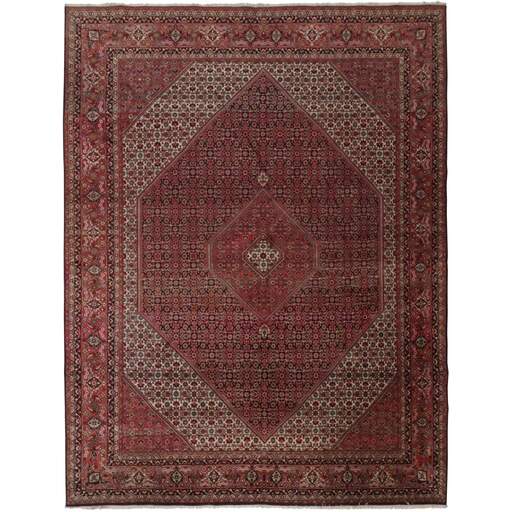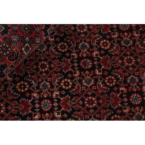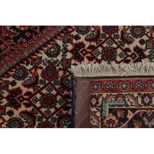 Bidjar est une ville d'environ 50 000 habitants située dans la province du Kurdistan, au nord-ouest du pays. Elle se trouve dans une vallée fertile entourée de montagnes arides et ne possède aucun monument important. La ville sert principalement de centre commercial pour les villages environnants. Son histoire récente est dramatique, car la ville a été occupée d'abord par les Russes, puis par les Turcs, pendant la Première Guerre mondiale, ce qui a entraîné une famine qui a considérablement réduit la population. Ces événements se reflètent dans la production de tapis de la ville. Avant la Première Guerre mondiale, les tapis étaient noués grossièrement mais fermement, avec une chaîne et une trame en laine. Plus tard, ils sont devenus plus fins et avaient des bases en coton. Les motifs Bidjar sont souvent Herati, mais parfois on peut voir un motif Mahi. Les couleurs sont généralement des rouges clairs avec une bordure légère. Les tapis Bidjar sont si fortement noués que vous risquez de casser les nœuds si vous les pliez ensemble avec le poil tourné vers l'intérieur. Lorsque vous pliez les tapis Bidjar, c'est donc toujours avec le poil tourné vers l'extérieur. On sent clairement que la laine utilisée dans un tapis Bidjar est bien plus importante que dans la plupart des autres tapis. Ils sont beaucoup plus lourds et ne sont pas aussi faciles à déplacer lorsqu'ils sont posés sur le sol.