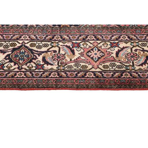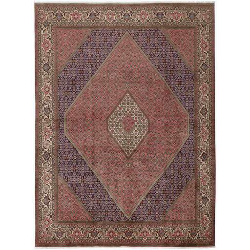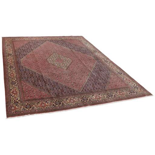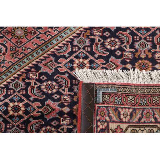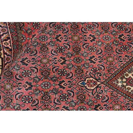 Bidjar est une ville d'environ 50 000 habitants située dans la province du Kurdistan, au nord-ouest du pays. Elle se trouve dans une vallée fertile entourée de montagnes arides et ne possède aucun monument important. La ville sert principalement de centre commercial pour les villages environnants. Son histoire récente est dramatique, car la ville a été occupée d'abord par les Russes, puis par les Turcs, pendant la Première Guerre mondiale, ce qui a entraîné une famine qui a considérablement réduit la population. Ces événements se reflètent dans la production de tapis de la ville. Avant la Première Guerre mondiale, les tapis étaient noués grossièrement mais fermement, avec une chaîne et une trame en laine. Plus tard, ils sont devenus plus fins et avaient des bases en coton. Les motifs Bidjar sont souvent Herati, mais parfois on peut voir un motif Mahi. Les couleurs sont généralement des rouges clairs avec une bordure légère. Les tapis Bidjar sont si fortement noués que vous risquez de casser les nœuds si vous les pliez ensemble avec le poil tourné vers l'intérieur. Lorsque vous pliez les tapis Bidjar, c'est donc toujours avec le poil tourné vers l'extérieur. On sent clairement que la laine utilisée dans un tapis Bidjar est bien plus importante que dans la plupart des autres tapis. Ils sont beaucoup plus lourds et ne sont pas aussi faciles à déplacer lorsqu'ils sont posés sur le sol.