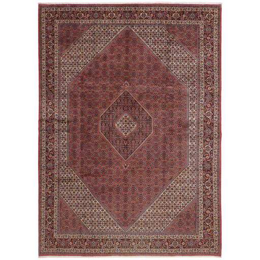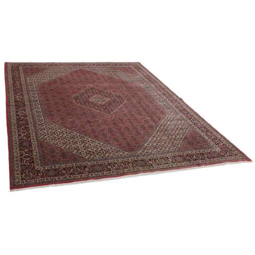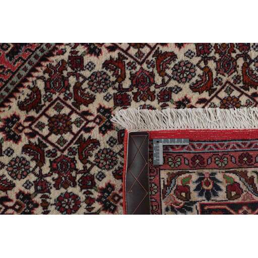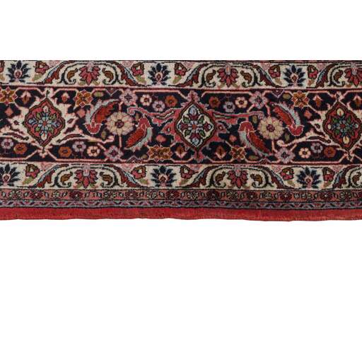 Bidjar est une ville d'environ 50 000 habitants située dans la province du Kurdistan, au nord-ouest du pays. Elle se trouve dans une vallée fertile entourée de montagnes arides et ne possède aucun monument important. La ville sert principalement de centre commercial pour les villages environnants. Son histoire récente est dramatique, car la ville a été occupée d'abord par les Russes, puis par les Turcs, pendant la Première Guerre mondiale, ce qui a entraîné une famine qui a considérablement réduit la population. Ces événements se reflètent dans la production de tapis de la ville. Avant la Première Guerre mondiale, les tapis étaient noués grossièrement mais fermement, avec une chaîne et une trame en laine. Plus tard, ils sont devenus plus fins et avaient des bases en coton. Les motifs Bidjar sont souvent Herati, mais parfois on peut voir un motif Mahi. Les couleurs sont généralement des rouges clairs avec une bordure légère. Les tapis Bidjar sont si fortement noués que vous risquez de casser les nœuds si vous les pliez ensemble avec le poil tourné vers l'intérieur. Lorsque vous pliez les tapis Bidjar, c'est donc toujours avec le poil tourné vers l'extérieur. On sent clairement que la laine utilisée dans un tapis Bidjar est bien plus importante que dans la plupart des autres tapis. Ils sont beaucoup plus lourds et ne sont pas aussi faciles à déplacer lorsqu'ils sont posés sur le sol.