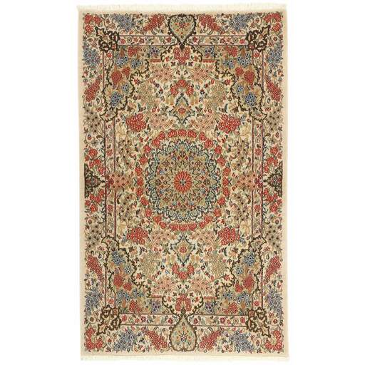 Ghom, ville d'un demi-million d'habitants, se trouve au sud de Téhéran, sur la route menant à la province de Markazi (centre). L'industrie du tapis de la ville ne s'est développée qu'après 1930, mais elle a acquis une bonne réputation. Comme il n'existe aucune tradition ou précédent sur lequel s'appuyer, les tisserands puisent leurs motifs dans différentes sources, d'où ils les transfèrent et les combinent. Certains motifs sont entièrement copiés et il n'est pas rare de voir des copies de tapis Joshqan ou Sirjan fabriquées à Ghom, mais elles sont beaucoup plus fines que les originales et réalisées avec un velours de soie. En outre, plusieurs variantes de médaillons et de motifs uniformes sont réalisées. Le velours est soit en soie avec chaîne et trame de soie, soit en laine, ou en laine mélangée à de la soie, avec une base en coton. Le nouage est généralement fin. Une large gamme de couleurs est utilisée, parfois dans des combinaisons qui semblent étranges aux Occidentaux. Un rose et un vert puissants sont particulièrement caractéristiques des tapis de soie.