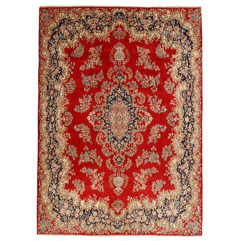 La ville de Kerman se situe dans le sud-est de l'Iran, à la lisière du désert de Kavir-e-Lut. C'est la capitale de la province de Kerman, qui compte environ un demi-million d'habitants. Son isolement géographique a permis la préservation de nombreux monuments – on compterait 90 mosquées – et un mausolée du XVe siècle à proximité de Mahan serait le plus bel édifice d'Iran. Comme Yazd au nord-ouest, Kerman compte une importante population de zoroastriens, qui adhèrent à l'ancienne religion iranienne, remplacée dans d'autres endroits par l'islam. La silhouette de Kerman est caractérisée par ses tours à vent – des constructions en forme de cheminée utilisées pour capter chaque brise et la conduire jusqu'aux parties intérieures de la maison. Kerman a une ancienne tradition textile, et des châles ont été tissés pendant une grande partie du XIXe siècle. Lorsque la demande de châles a chuté, les tisserands ont changé leurs métiers à tisser pour la production de tapis. Au début, ils utilisaient les mêmes motifs que pour les châles, mais ils les ont adaptés au gré des changements de mode, même si les tapis de Kerman ont conservé leurs couleurs et motifs délicats. Toutes les tailles sont fabriquées. Les plus grands tapis ont des couleurs et des motifs uniques et sont souvent noués dans les villes du nord de Lavar ou Ravar. Outre les motifs des châles, Kerman propose souvent des adaptations du motif Boteh avec des bouquets de fleurs naturelles ou des adaptations de motifs de tapis classiques. Une large gamme de couleurs délicates est utilisée. Le velours est généralement doux, comme du velours de laine, tandis que la chaîne et la trame sont toujours en coton.