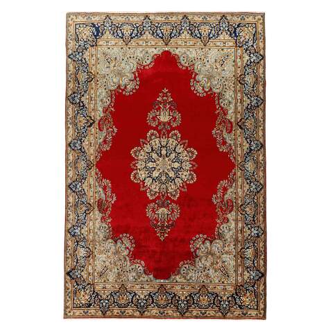 La ville de Kerman se situe dans le sud-est de l'Iran, à la lisière du désert de Kavir-e-Lut. C'est la capitale de la province de Kerman, qui compte environ un demi-million d'habitants. Son isolement géographique a permis la préservation de nombreux monuments – on compterait 90 mosquées – et un mausolée du XVe siècle à proximité de Mahan serait le plus bel édifice d'Iran. Comme Yazd au nord-ouest, Kerman compte une importante population de zoroastriens, qui adhèrent à l'ancienne religion iranienne, remplacée dans d'autres endroits par l'islam. La silhouette de Kerman est caractérisée par ses tours à vent – des constructions en forme de cheminée utilisées pour capter chaque brise et la conduire jusqu'aux parties intérieures de la maison. Kerman a une ancienne tradition textile, et des châles ont été tissés pendant une grande partie du XIXe siècle. Lorsque la demande de châles a chuté, les tisserands ont changé leurs métiers à tisser pour la production de tapis. Au début, ils utilisaient les mêmes motifs que pour les châles, mais ils les ont adaptés au gré des changements de mode, même si les tapis de Kerman ont conservé leurs couleurs et motifs délicats. Toutes les tailles sont fabriquées. Les plus grands tapis ont des couleurs et des motifs uniques et sont souvent noués dans les villes du nord de Lavar ou Ravar. Outre les motifs des châles, Kerman propose souvent des adaptations du motif Boteh avec des bouquets de fleurs naturelles ou des adaptations de motifs de tapis classiques. Une large gamme de couleurs délicates est utilisée. Le velours est généralement doux, comme du velours de laine, tandis que la chaîne et la trame sont toujours en coton.