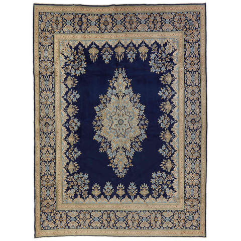 La ville de Kerman se situe dans le sud-est de l'Iran, à la lisière du désert de Kavir-e-Lut. C'est la capitale de la province de Kerman, qui compte environ un demi-million d'habitants. Son isolement géographique a permis la préservation de nombreux monuments – on compterait 90 mosquées – et un mausolée du XVe siècle à proximité de Mahan serait le plus bel édifice d'Iran. Comme Yazd au nord-ouest, Kerman compte une importante population de zoroastriens, qui adhèrent à l'ancienne religion iranienne, remplacée dans d'autres endroits par l'islam. La silhouette de Kerman est caractérisée par ses tours à vent – des constructions en forme de cheminée utilisées pour capter chaque brise et la conduire jusqu'aux parties intérieures de la maison. Kerman a une ancienne tradition textile, et des châles ont été tissés pendant une grande partie du XIXe siècle. Lorsque la demande de châles a chuté, les tisserands ont changé leurs métiers à tisser pour la production de tapis. Au début, ils utilisaient les mêmes motifs que pour les châles, mais ils les ont adaptés au gré des changements de mode, même si les tapis de Kerman ont conservé leurs couleurs et motifs délicats. Toutes les tailles sont fabriquées. Les plus grands tapis ont des couleurs et des motifs uniques et sont souvent noués dans les villes du nord de Lavar ou Ravar. Outre les motifs des châles, Kerman propose souvent des adaptations du motif Boteh avec des bouquets de fleurs naturelles ou des adaptations de motifs de tapis classiques. Une large gamme de couleurs délicates est utilisée. Le velours est généralement doux, comme du velours de laine, tandis que la chaîne et la trame sont toujours en coton.