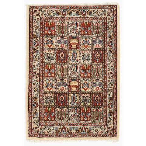 Moud est une petite ville au sud de Mashad, dans la province de Khorrasan. Les tapis de cette région se caractérisent par l'homogénéité de leurs motifs et de leur qualité. La chaîne et la trame sont en coton et le velours en laine. Les bordures sont une version de la bordure persane traditionnelle en tortue. Les tapis sont fabriqués dans toutes les tailles. Les tapis Moud sont souvent copiés en Inde, en raison de leur remarquable homogénéité. Les motifs caractéristiques de Moud sont parmi les plus uniformes, les plus réguliers et les plus facilement reconnaissables de la province de Khorrasan. Les Moud Mahi sont fabriqués dans des tons beige, rouge clair ou bleu, avec des motifs Mahi sur toute la surface ou avec un médaillon en forme d'étoile. Mahi signifie poisson et le motif Mahi est le motif le plus couramment utilisé dans les véritables tapis persans. En l'observant de près, vous pouvez voir un étang entouré de quatre poissons.
