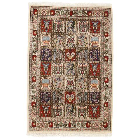 Moud est une petite ville au sud de Mashad, dans la province de Khorrasan. Les tapis de cette région se caractérisent par l'homogénéité de leurs motifs et de leur qualité. La chaîne et la trame sont en coton et le velours en laine. Les bordures sont une version de la bordure persane traditionnelle en tortue. Les tapis sont fabriqués dans toutes les tailles. Les tapis Moud sont souvent copiés en Inde, en raison de leur remarquable homogénéité. Les motifs caractéristiques de Moud sont parmi les plus uniformes, les plus réguliers et les plus facilement reconnaissables de la province de Khorrasan. Les Moud Mahi sont fabriqués dans des tons beige, rouge clair ou bleu, avec des motifs Mahi sur toute la surface ou avec un médaillon en forme d'étoile. Mahi signifie poisson et le motif Mahi est le motif le plus couramment utilisé dans les véritables tapis persans. En l'observant de près, vous pouvez voir un étang entouré de quatre poissons.