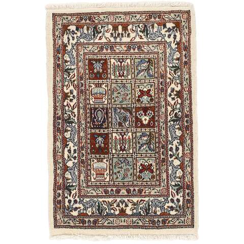 Moud est une petite ville au sud de Mashad, dans la province de Khorrasan. Les tapis de cette région se caractérisent par l'homogénéité de leurs motifs et de leur qualité. La chaîne et la trame sont en coton et le velours en laine. Les bordures sont une version de la bordure persane traditionnelle en tortue. Les tapis sont fabriqués dans toutes les tailles. Les tapis Moud sont souvent copiés en Inde, en raison de leur remarquable homogénéité. Les motifs caractéristiques de Moud sont parmi les plus uniformes, les plus réguliers et les plus facilement reconnaissables de la province de Khorrasan. Les Moud Mahi sont fabriqués dans des tons beige, rouge clair ou bleu, avec des motifs Mahi sur toute la surface ou avec un médaillon en forme d'étoile. Mahi signifie poisson et le motif Mahi est le motif le plus couramment utilisé dans les véritables tapis persans. En l'observant de près, vous pouvez voir un étang entouré de quatre poissons.