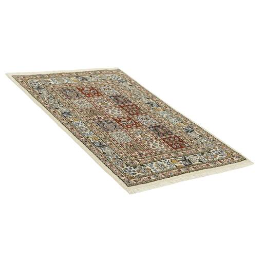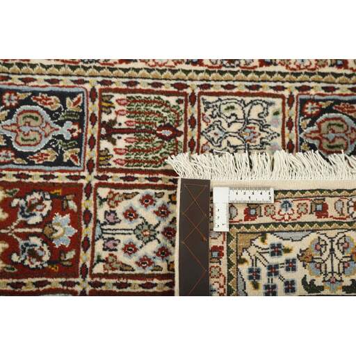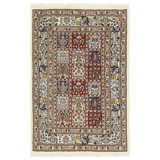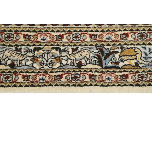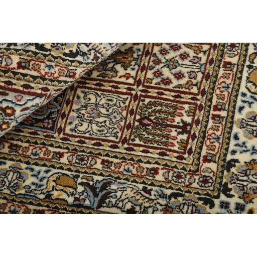 Moud est une petite ville au sud de Mashad, dans la province de Khorrasan. Les tapis de cette région se caractérisent par l'homogénéité de leurs motifs et de leur qualité. La chaîne et la trame sont en coton et le velours en laine. Les bordures sont une version de la bordure persane traditionnelle en tortue. Les tapis sont fabriqués dans toutes les tailles. Les tapis Moud sont souvent copiés en Inde, en raison de leur remarquable homogénéité. Les motifs caractéristiques de Moud sont parmi les plus uniformes, les plus réguliers et les plus facilement reconnaissables de la province de Khorrasan. Les Moud Mahi sont fabriqués dans des tons beige, rouge clair ou bleu, avec des motifs Mahi sur toute la surface ou avec un médaillon en forme d'étoile. Mahi signifie poisson et le motif Mahi est le motif le plus couramment utilisé dans les véritables tapis persans. En l'observant de près, vous pouvez voir un étang entouré de quatre poissons.