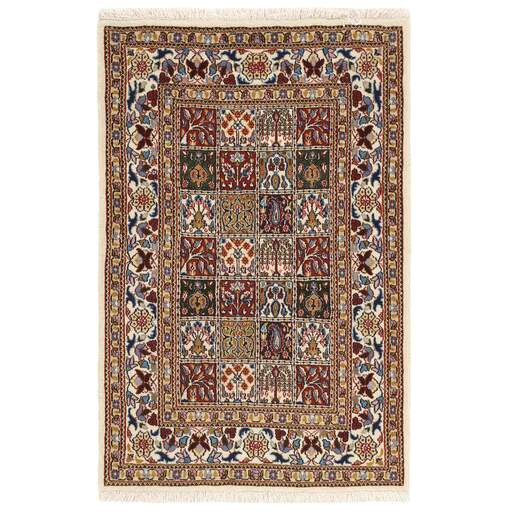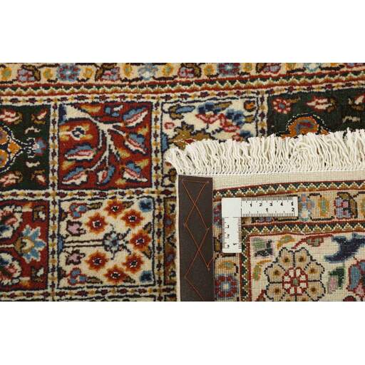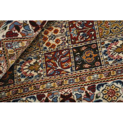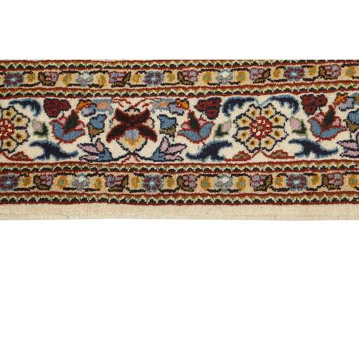 Moud est une petite ville au sud de Mashad, dans la province de Khorrasan. Les tapis de cette région se caractérisent par l'homogénéité de leurs motifs et de leur qualité. La chaîne et la trame sont en coton et le velours en laine. Les bordures sont une version de la bordure persane traditionnelle en tortue. Les tapis sont fabriqués dans toutes les tailles. Les tapis Moud sont souvent copiés en Inde, en raison de leur remarquable homogénéité. Les motifs caractéristiques de Moud sont parmi les plus uniformes, les plus réguliers et les plus facilement reconnaissables de la province de Khorrasan. Les Moud Mahi sont fabriqués dans des tons beige, rouge clair ou bleu, avec des motifs Mahi sur toute la surface ou avec un médaillon en forme d'étoile. Mahi signifie poisson et le motif Mahi est le motif le plus couramment utilisé dans les véritables tapis persans. En l'observant de près, vous pouvez voir un étang entouré de quatre poissons.