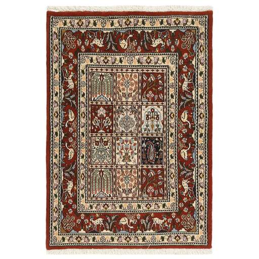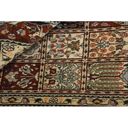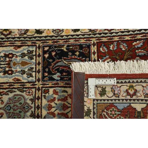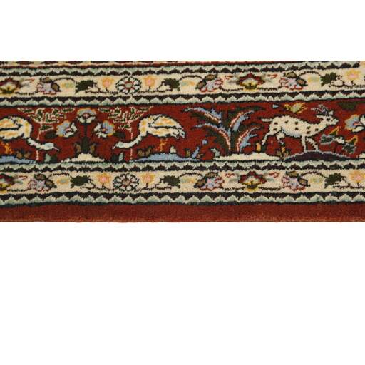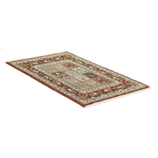 Moud est une petite ville au sud de Mashad, dans la province de Khorrasan. Les tapis de cette région se caractérisent par l'homogénéité de leurs motifs et de leur qualité. La chaîne et la trame sont en coton et le velours en laine. Les bordures sont une version de la bordure persane traditionnelle en tortue. Les tapis sont fabriqués dans toutes les tailles. Les tapis Moud sont souvent copiés en Inde, en raison de leur remarquable homogénéité. Les motifs caractéristiques de Moud sont parmi les plus uniformes, les plus réguliers et les plus facilement reconnaissables de la province de Khorrasan. Les Moud Mahi sont fabriqués dans des tons beige, rouge clair ou bleu, avec des motifs Mahi sur toute la surface ou avec un médaillon en forme d'étoile. Mahi signifie poisson et le motif Mahi est le motif le plus couramment utilisé dans les véritables tapis persans. En l'observant de près, vous pouvez voir un étang entouré de quatre poissons.