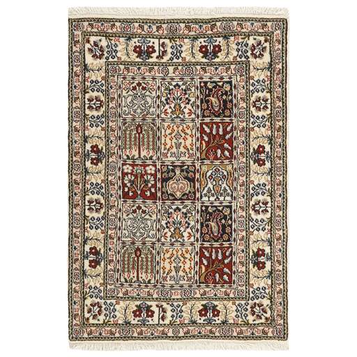 Moud est une petite ville au sud de Mashad, dans la province de Khorrasan. Les tapis de cette région se caractérisent par l'homogénéité de leurs motifs et de leur qualité. La chaîne et la trame sont en coton et le velours en laine. Les bordures sont une version de la bordure persane traditionnelle en tortue. Les tapis sont fabriqués dans toutes les tailles. Les tapis Moud sont souvent copiés en Inde, en raison de leur remarquable homogénéité. Les motifs caractéristiques de Moud sont parmi les plus uniformes, les plus réguliers et les plus facilement reconnaissables de la province de Khorrasan. Les Moud Mahi sont fabriqués dans des tons beige, rouge clair ou bleu, avec des motifs Mahi sur toute la surface ou avec un médaillon en forme d'étoile. Mahi signifie poisson et le motif Mahi est le motif le plus couramment utilisé dans les véritables tapis persans. En l'observant de près, vous pouvez voir un étang entouré de quatre poissons.