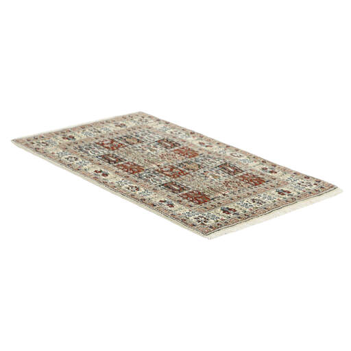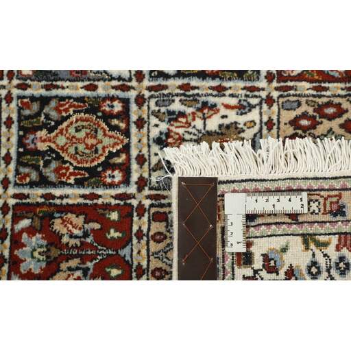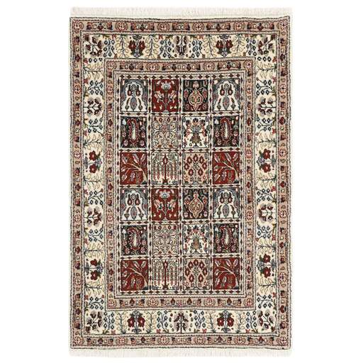 Moud est une petite ville au sud de Mashad, dans la province de Khorrasan. Les tapis de cette région se caractérisent par l'homogénéité de leurs motifs et de leur qualité. La chaîne et la trame sont en coton et le velours en laine. Les bordures sont une version de la bordure persane traditionnelle en tortue. Les tapis sont fabriqués dans toutes les tailles. Les tapis Moud sont souvent copiés en Inde, en raison de leur remarquable homogénéité. Les motifs caractéristiques de Moud sont parmi les plus uniformes, les plus réguliers et les plus facilement reconnaissables de la province de Khorrasan. Les Moud Mahi sont fabriqués dans des tons beige, rouge clair ou bleu, avec des motifs Mahi sur toute la surface ou avec un médaillon en forme d'étoile. Mahi signifie poisson et le motif Mahi est le motif le plus couramment utilisé dans les véritables tapis persans. En l'observant de près, vous pouvez voir un étang entouré de quatre poissons.