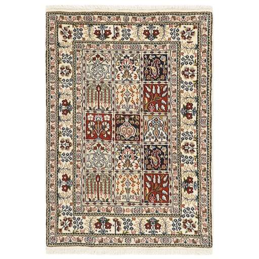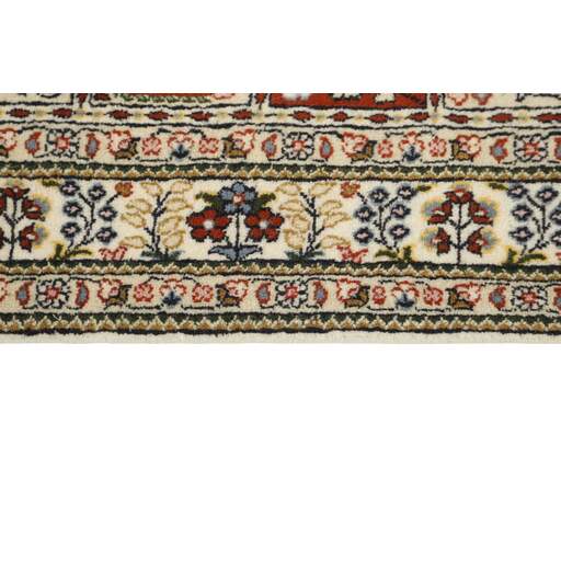 Moud est une petite ville au sud de Mashad, dans la province de Khorrasan. Les tapis de cette région se caractérisent par l'homogénéité de leurs motifs et de leur qualité. La chaîne et la trame sont en coton et le velours en laine. Les bordures sont une version de la bordure persane traditionnelle en tortue. Les tapis sont fabriqués dans toutes les tailles. Les tapis Moud sont souvent copiés en Inde, en raison de leur remarquable homogénéité. Les motifs caractéristiques de Moud sont parmi les plus uniformes, les plus réguliers et les plus facilement reconnaissables de la province de Khorrasan. Les Moud Mahi sont fabriqués dans des tons beige, rouge clair ou bleu, avec des motifs Mahi sur toute la surface ou avec un médaillon en forme d'étoile. Mahi signifie poisson et le motif Mahi est le motif le plus couramment utilisé dans les véritables tapis persans. En l'observant de près, vous pouvez voir un étang entouré de quatre poissons.