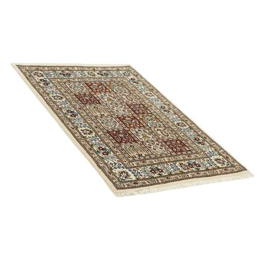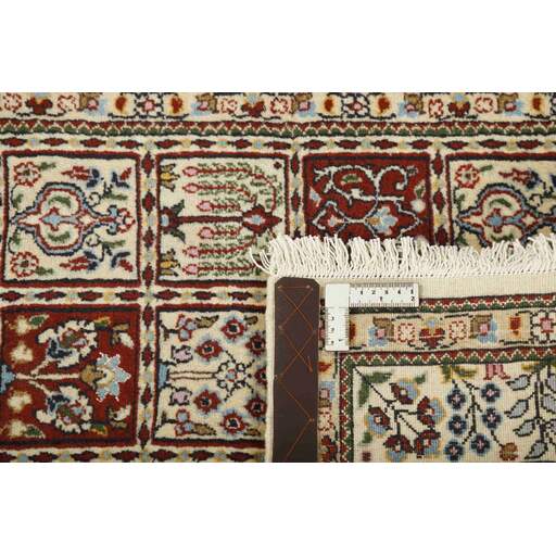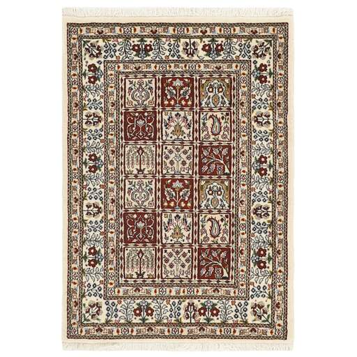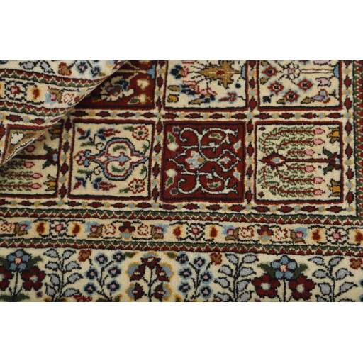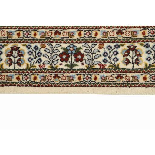 Moud est une petite ville au sud de Mashad, dans la province de Khorrasan. Les tapis de cette région se caractérisent par l'homogénéité de leurs motifs et de leur qualité. La chaîne et la trame sont en coton et le velours en laine. Les bordures sont une version de la bordure persane traditionnelle en tortue. Les tapis sont fabriqués dans toutes les tailles. Les tapis Moud sont souvent copiés en Inde, en raison de leur remarquable homogénéité. Les motifs caractéristiques de Moud sont parmi les plus uniformes, les plus réguliers et les plus facilement reconnaissables de la province de Khorrasan. Les Moud Mahi sont fabriqués dans des tons beige, rouge clair ou bleu, avec des motifs Mahi sur toute la surface ou avec un médaillon en forme d'étoile. Mahi signifie poisson et le motif Mahi est le motif le plus couramment utilisé dans les véritables tapis persans. En l'observant de près, vous pouvez voir un étang entouré de quatre poissons.