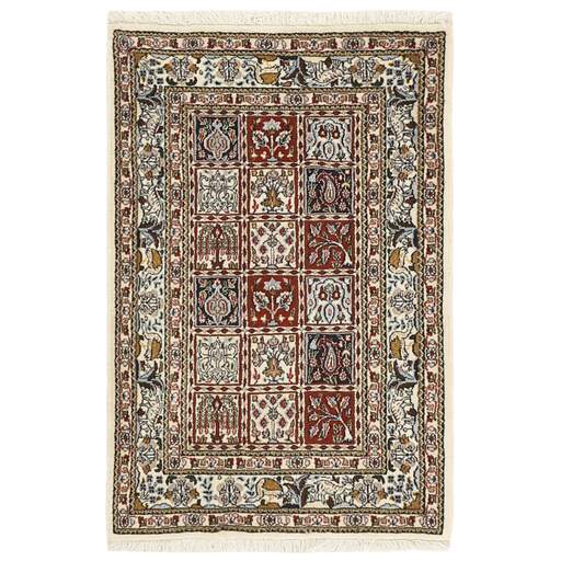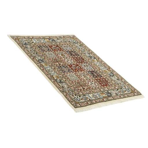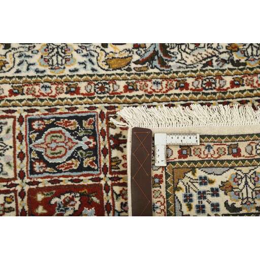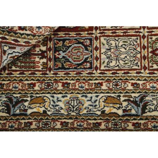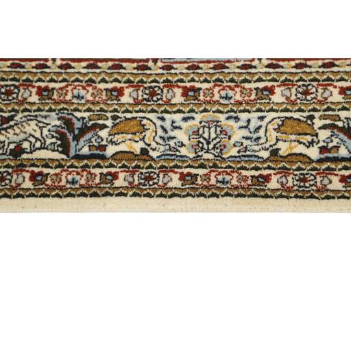 Moud est une petite ville au sud de Mashad, dans la province de Khorrasan. Les tapis de cette région se caractérisent par l'homogénéité de leurs motifs et de leur qualité. La chaîne et la trame sont en coton et le velours en laine. Les bordures sont une version de la bordure persane traditionnelle en tortue. Les tapis sont fabriqués dans toutes les tailles. Les tapis Moud sont souvent copiés en Inde, en raison de leur remarquable homogénéité. Les motifs caractéristiques de Moud sont parmi les plus uniformes, les plus réguliers et les plus facilement reconnaissables de la province de Khorrasan. Les Moud Mahi sont fabriqués dans des tons beige, rouge clair ou bleu, avec des motifs Mahi sur toute la surface ou avec un médaillon en forme d'étoile. Mahi signifie poisson et le motif Mahi est le motif le plus couramment utilisé dans les véritables tapis persans. En l'observant de près, vous pouvez voir un étang entouré de quatre poissons.