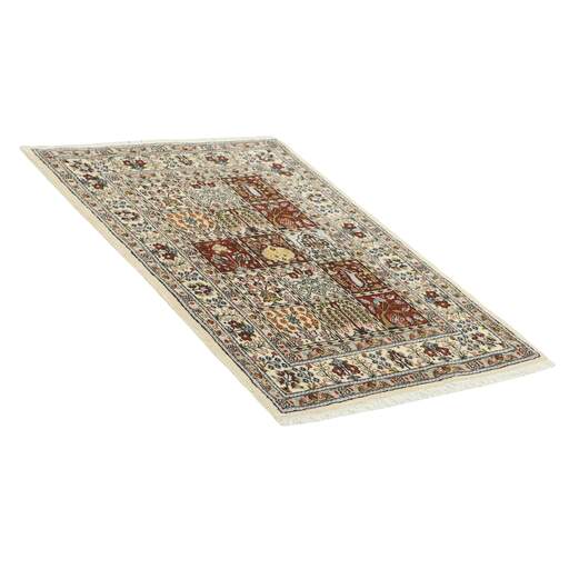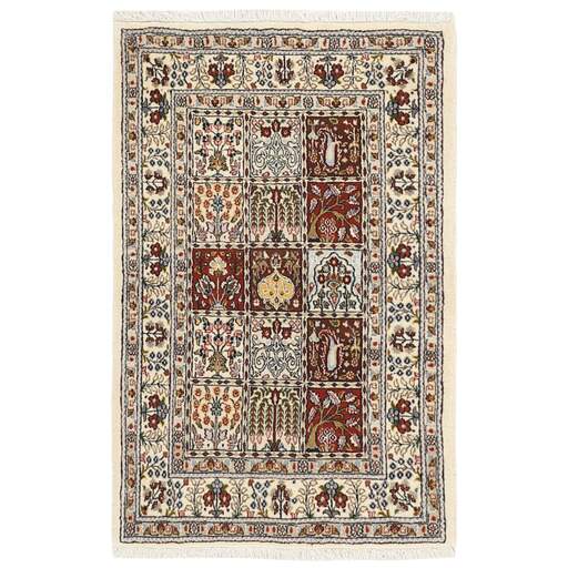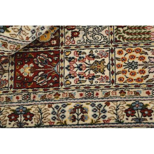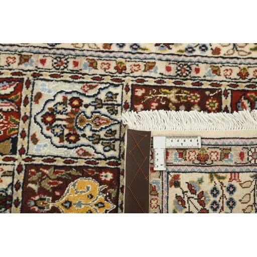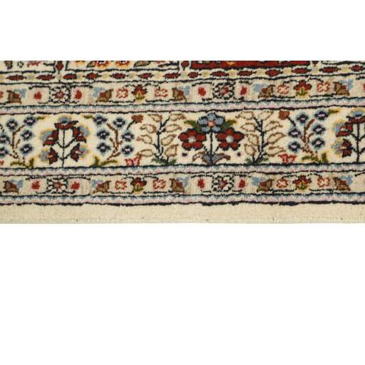 Moud est une petite ville au sud de Mashad, dans la province de Khorrasan. Les tapis de cette région se caractérisent par l'homogénéité de leurs motifs et de leur qualité. La chaîne et la trame sont en coton et le velours en laine. Les bordures sont une version de la bordure persane traditionnelle en tortue. Les tapis sont fabriqués dans toutes les tailles. Les tapis Moud sont souvent copiés en Inde, en raison de leur remarquable homogénéité. Les motifs caractéristiques de Moud sont parmi les plus uniformes, les plus réguliers et les plus facilement reconnaissables de la province de Khorrasan. Les Moud Mahi sont fabriqués dans des tons beige, rouge clair ou bleu, avec des motifs Mahi sur toute la surface ou avec un médaillon en forme d'étoile. Mahi signifie poisson et le motif Mahi est le motif le plus couramment utilisé dans les véritables tapis persans. En l'observant de près, vous pouvez voir un étang entouré de quatre poissons.