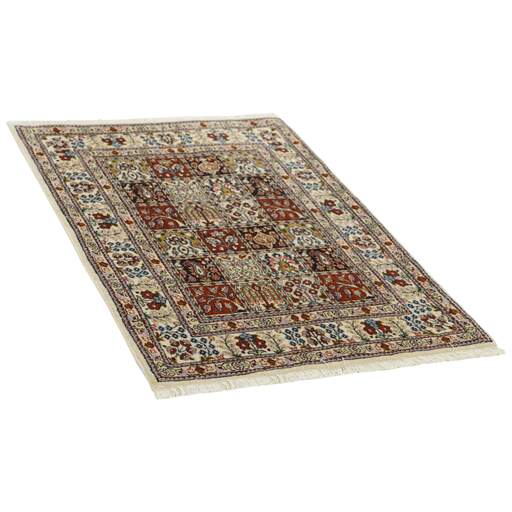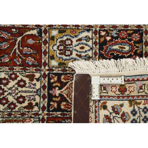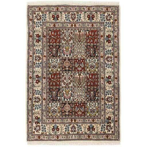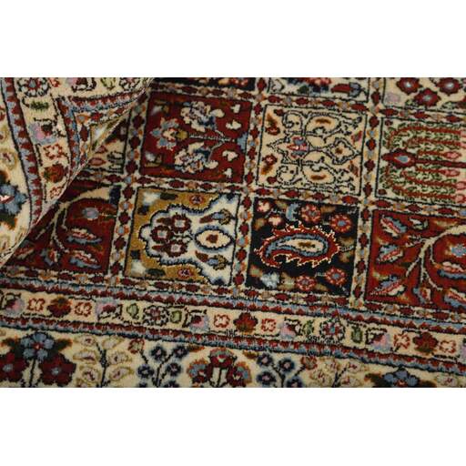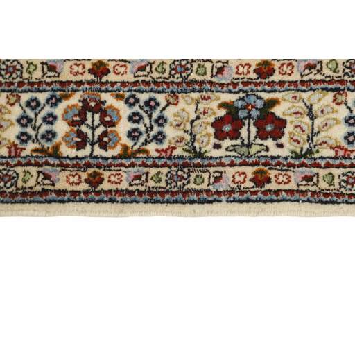 Moud est une petite ville au sud de Mashad, dans la province de Khorrasan. Les tapis de cette région se caractérisent par l'homogénéité de leurs motifs et de leur qualité. La chaîne et la trame sont en coton et le velours en laine. Les bordures sont une version de la bordure persane traditionnelle en tortue. Les tapis sont fabriqués dans toutes les tailles. Les tapis Moud sont souvent copiés en Inde, en raison de leur remarquable homogénéité. Les motifs caractéristiques de Moud sont parmi les plus uniformes, les plus réguliers et les plus facilement reconnaissables de la province de Khorrasan. Les Moud Mahi sont fabriqués dans des tons beige, rouge clair ou bleu, avec des motifs Mahi sur toute la surface ou avec un médaillon en forme d'étoile. Mahi signifie poisson et le motif Mahi est le motif le plus couramment utilisé dans les véritables tapis persans. En l'observant de près, vous pouvez voir un étang entouré de quatre poissons.