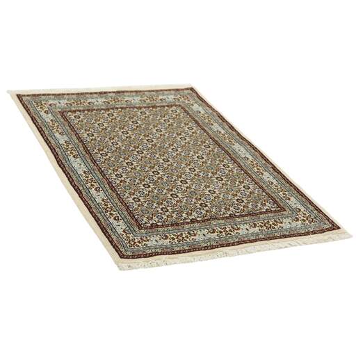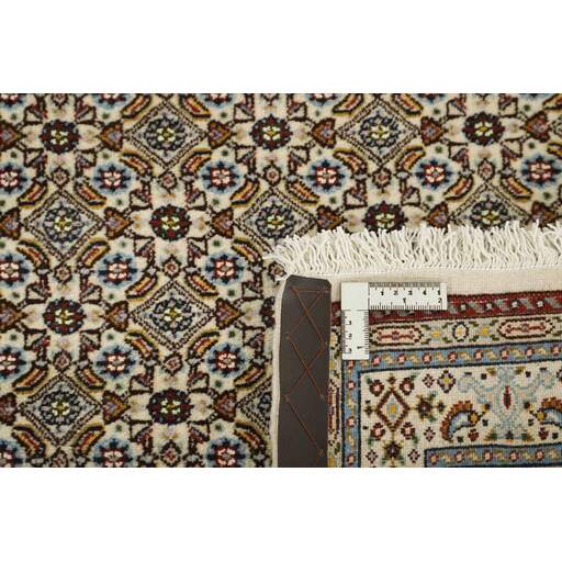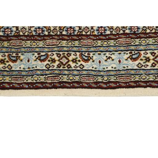 Moud est une petite ville au sud de Mashad, dans la province de Khorrasan. Les tapis de cette région se caractérisent par l'homogénéité de leurs motifs et de leur qualité. La chaîne et la trame sont en coton et le velours en laine. Les bordures sont une version de la bordure persane traditionnelle en tortue. Les tapis sont fabriqués dans toutes les tailles. Les tapis Moud sont souvent copiés en Inde, en raison de leur remarquable homogénéité. Les motifs caractéristiques de Moud sont parmi les plus uniformes, les plus réguliers et les plus facilement reconnaissables de la province de Khorrasan. Les Moud Mahi sont fabriqués dans des tons beige, rouge clair ou bleu, avec des motifs Mahi sur toute la surface ou avec un médaillon en forme d'étoile. Mahi signifie poisson et le motif Mahi est le motif le plus couramment utilisé dans les véritables tapis persans. En l'observant de près, vous pouvez voir un étang entouré de quatre poissons.