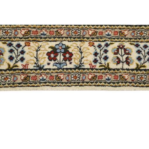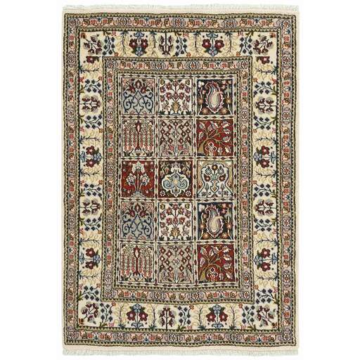 Moud est une petite ville au sud de Mashad, dans la province de Khorrasan. Les tapis de cette région se caractérisent par l'homogénéité de leurs motifs et de leur qualité. La chaîne et la trame sont en coton et le velours en laine. Les bordures sont une version de la bordure persane traditionnelle en tortue. Les tapis sont fabriqués dans toutes les tailles. Les tapis Moud sont souvent copiés en Inde, en raison de leur remarquable homogénéité. Les motifs caractéristiques de Moud sont parmi les plus uniformes, les plus réguliers et les plus facilement reconnaissables de la province de Khorrasan. Les Moud Mahi sont fabriqués dans des tons beige, rouge clair ou bleu, avec des motifs Mahi sur toute la surface ou avec un médaillon en forme d'étoile. Mahi signifie poisson et le motif Mahi est le motif le plus couramment utilisé dans les véritables tapis persans. En l'observant de près, vous pouvez voir un étang entouré de quatre poissons.