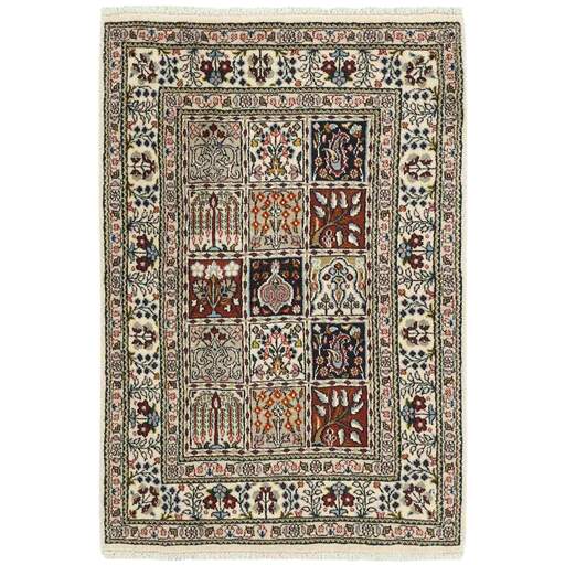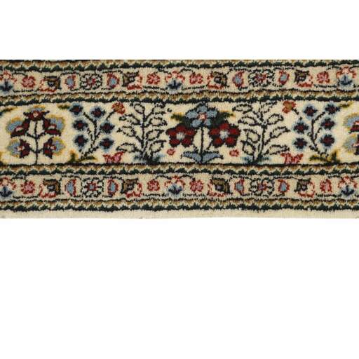 Moud est une petite ville au sud de Mashad, dans la province de Khorrasan. Les tapis de cette région se caractérisent par l'homogénéité de leurs motifs et de leur qualité. La chaîne et la trame sont en coton et le velours en laine. Les bordures sont une version de la bordure persane traditionnelle en tortue. Les tapis sont fabriqués dans toutes les tailles. Les tapis Moud sont souvent copiés en Inde, en raison de leur remarquable homogénéité. Les motifs caractéristiques de Moud sont parmi les plus uniformes, les plus réguliers et les plus facilement reconnaissables de la province de Khorrasan. Les Moud Mahi sont fabriqués dans des tons beige, rouge clair ou bleu, avec des motifs Mahi sur toute la surface ou avec un médaillon en forme d'étoile. Mahi signifie poisson et le motif Mahi est le motif le plus couramment utilisé dans les véritables tapis persans. En l'observant de près, vous pouvez voir un étang entouré de quatre poissons.