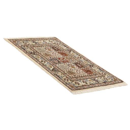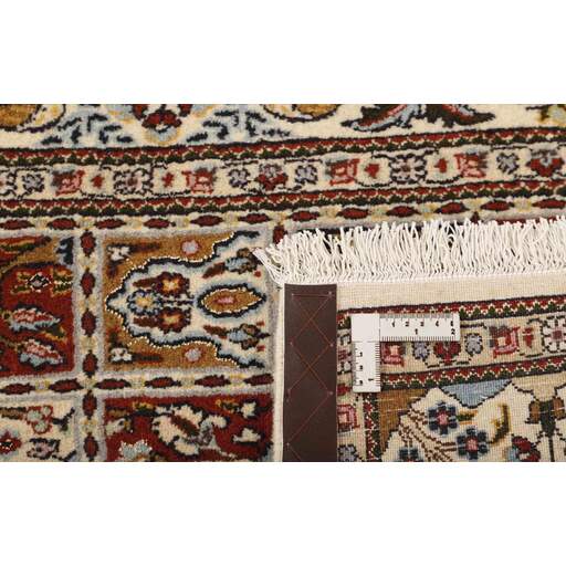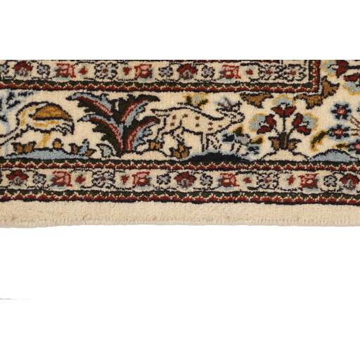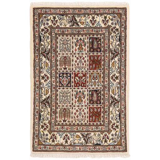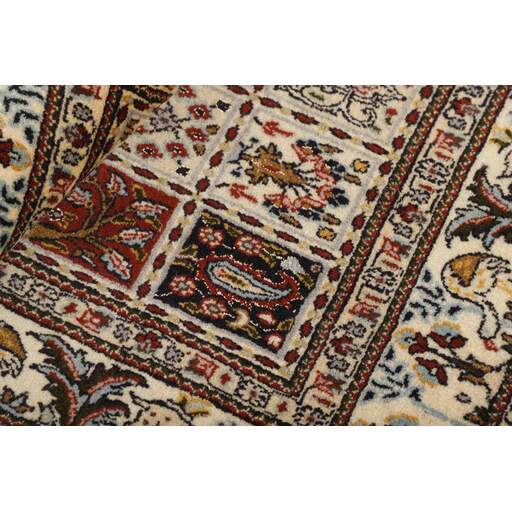 Moud est une petite ville au sud de Mashad, dans la province de Khorrasan. Les tapis de cette région se caractérisent par l'homogénéité de leurs motifs et de leur qualité. La chaîne et la trame sont en coton et le velours en laine. Les bordures sont une version de la bordure persane traditionnelle en tortue. Les tapis sont fabriqués dans toutes les tailles. Les tapis Moud sont souvent copiés en Inde, en raison de leur remarquable homogénéité. Les motifs caractéristiques de Moud sont parmi les plus uniformes, les plus réguliers et les plus facilement reconnaissables de la province de Khorrasan. Les Moud Mahi sont fabriqués dans des tons beige, rouge clair ou bleu, avec des motifs Mahi sur toute la surface ou avec un médaillon en forme d'étoile. Mahi signifie poisson et le motif Mahi est le motif le plus couramment utilisé dans les véritables tapis persans. En l'observant de près, vous pouvez voir un étang entouré de quatre poissons.