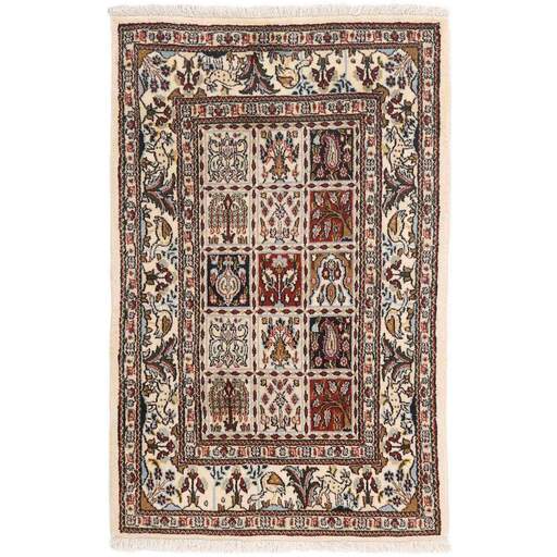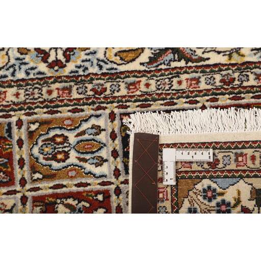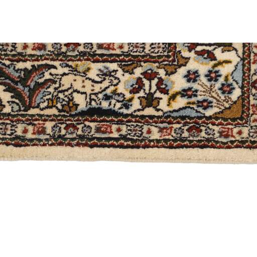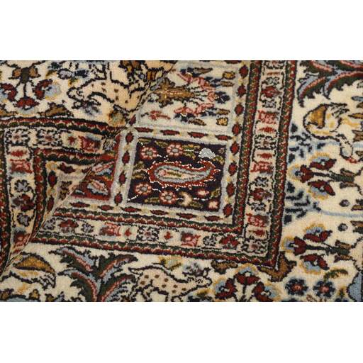 Moud est une petite ville au sud de Mashad, dans la province de Khorrasan. Les tapis de cette région se caractérisent par l'homogénéité de leurs motifs et de leur qualité. La chaîne et la trame sont en coton et le velours en laine. Les bordures sont une version de la bordure persane traditionnelle en tortue. Les tapis sont fabriqués dans toutes les tailles. Les tapis Moud sont souvent copiés en Inde, en raison de leur remarquable homogénéité. Les motifs caractéristiques de Moud sont parmi les plus uniformes, les plus réguliers et les plus facilement reconnaissables de la province de Khorrasan. Les Moud Mahi sont fabriqués dans des tons beige, rouge clair ou bleu, avec des motifs Mahi sur toute la surface ou avec un médaillon en forme d'étoile. Mahi signifie poisson et le motif Mahi est le motif le plus couramment utilisé dans les véritables tapis persans. En l'observant de près, vous pouvez voir un étang entouré de quatre poissons.