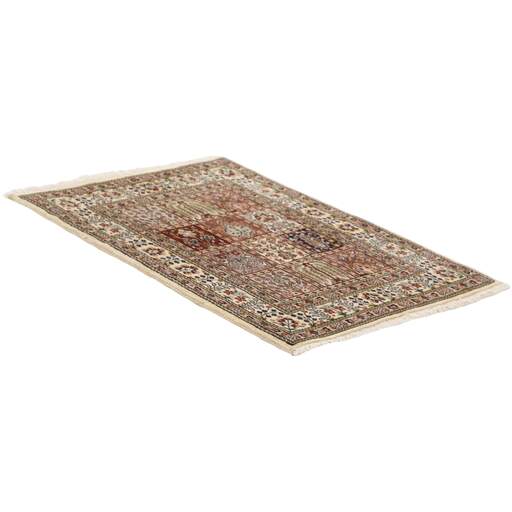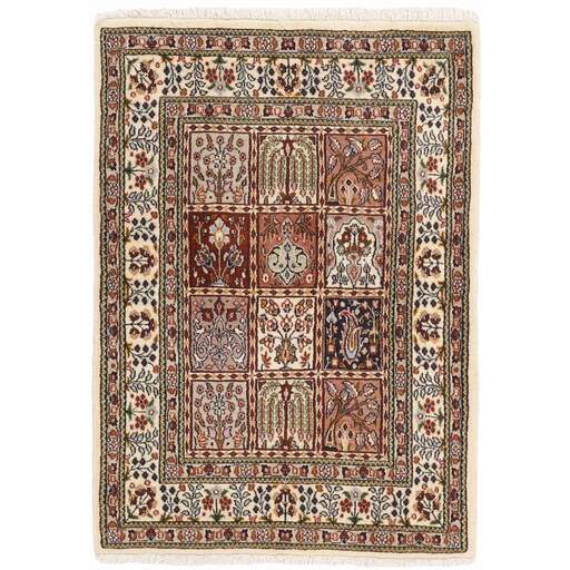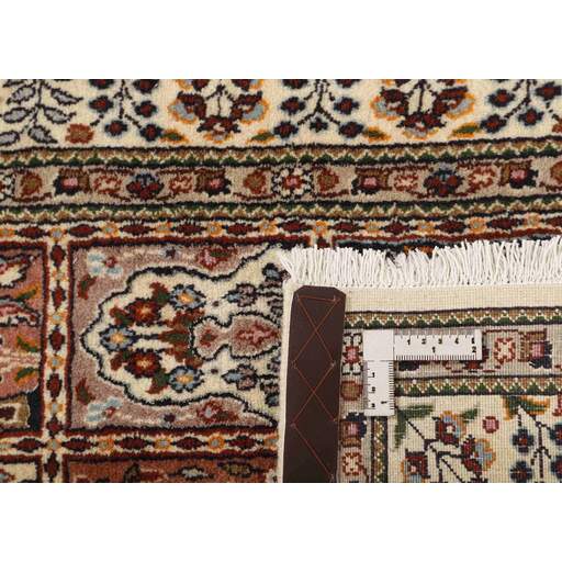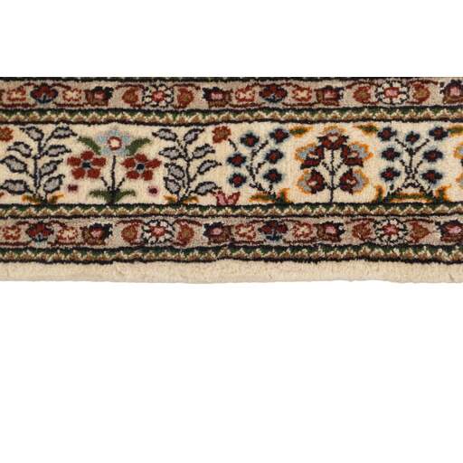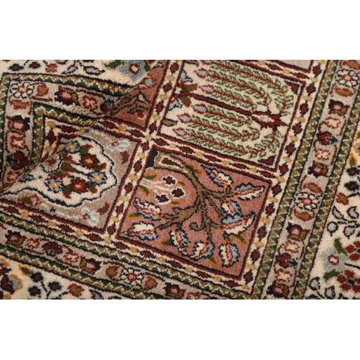 Moud est une petite ville au sud de Mashad, dans la province de Khorrasan. Les tapis de cette région se caractérisent par l'homogénéité de leurs motifs et de leur qualité. La chaîne et la trame sont en coton et le velours en laine. Les bordures sont une version de la bordure persane traditionnelle en tortue. Les tapis sont fabriqués dans toutes les tailles. Les tapis Moud sont souvent copiés en Inde, en raison de leur remarquable homogénéité. Les motifs caractéristiques de Moud sont parmi les plus uniformes, les plus réguliers et les plus facilement reconnaissables de la province de Khorrasan. Les Moud Mahi sont fabriqués dans des tons beige, rouge clair ou bleu, avec des motifs Mahi sur toute la surface ou avec un médaillon en forme d'étoile. Mahi signifie poisson et le motif Mahi est le motif le plus couramment utilisé dans les véritables tapis persans. En l'observant de près, vous pouvez voir un étang entouré de quatre poissons.