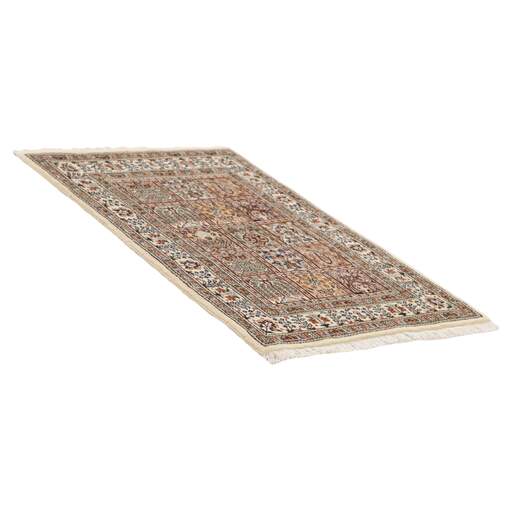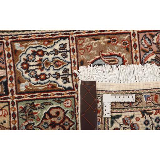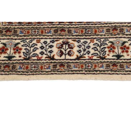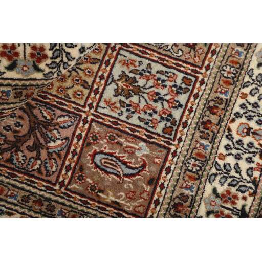Moud est une petite ville au sud de Mashad, dans la province de Khorrasan. Les tapis de cette région se caractérisent par l'homogénéité de leurs motifs et de leur qualité. La chaîne et la trame sont en coton et le velours en laine. Les bordures sont une version de la bordure persane traditionnelle en tortue. Les tapis sont fabriqués dans toutes les tailles. Les tapis Moud sont souvent copiés en Inde, en raison de leur remarquable homogénéité. Les motifs caractéristiques de Moud sont parmi les plus uniformes, les plus réguliers et les plus facilement reconnaissables de la province de Khorrasan. Les Moud Mahi sont fabriqués dans des tons beige, rouge clair ou bleu, avec des motifs Mahi sur toute la surface ou avec un médaillon en forme d'étoile. Mahi signifie poisson et le motif Mahi est le motif le plus couramment utilisé dans les véritables tapis persans. En l'observant de près, vous pouvez voir un étang entouré de quatre poissons.