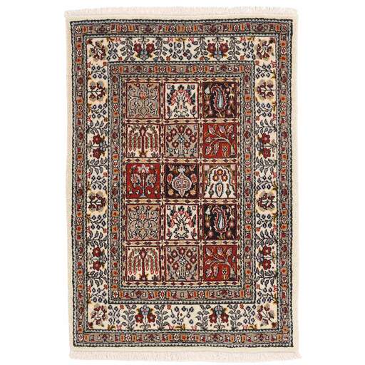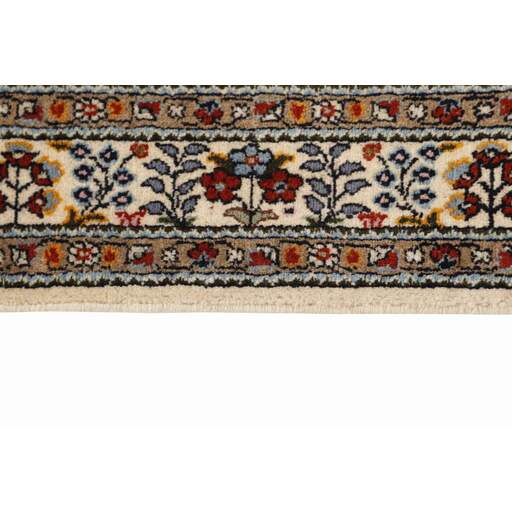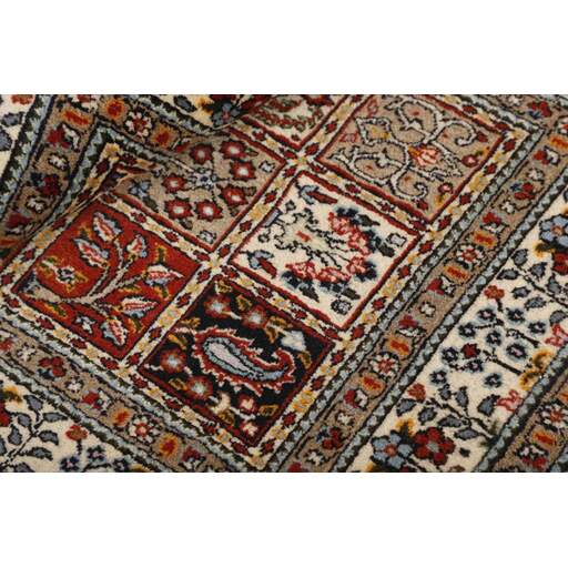 Moud est une petite ville au sud de Mashad, dans la province de Khorrasan. Les tapis de cette région se caractérisent par l'homogénéité de leurs motifs et de leur qualité. La chaîne et la trame sont en coton et le velours en laine. Les bordures sont une version de la bordure persane traditionnelle en tortue. Les tapis sont fabriqués dans toutes les tailles. Les tapis Moud sont souvent copiés en Inde, en raison de leur remarquable homogénéité. Les motifs caractéristiques de Moud sont parmi les plus uniformes, les plus réguliers et les plus facilement reconnaissables de la province de Khorrasan. Les Moud Mahi sont fabriqués dans des tons beige, rouge clair ou bleu, avec des motifs Mahi sur toute la surface ou avec un médaillon en forme d'étoile. Mahi signifie poisson et le motif Mahi est le motif le plus couramment utilisé dans les véritables tapis persans. En l'observant de près, vous pouvez voir un étang entouré de quatre poissons.