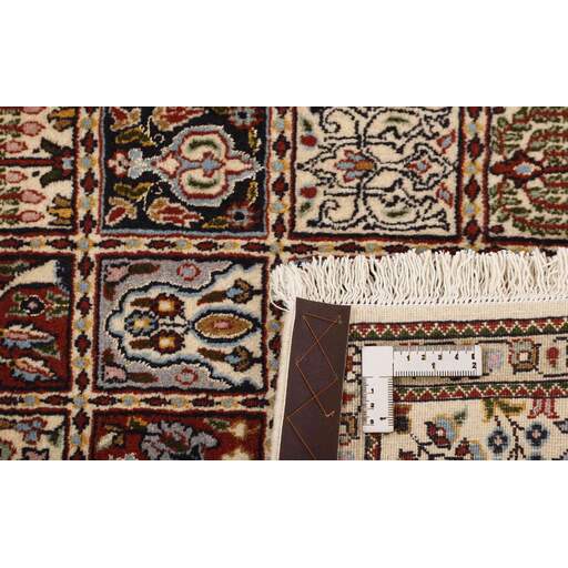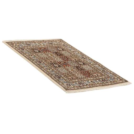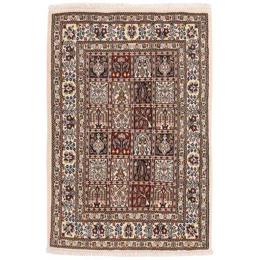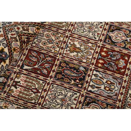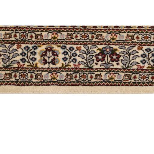 Moud est une petite ville au sud de Mashad, dans la province de Khorrasan. Les tapis de cette région se caractérisent par l'homogénéité de leurs motifs et de leur qualité. La chaîne et la trame sont en coton et le velours en laine. Les bordures sont une version de la bordure persane traditionnelle en tortue. Les tapis sont fabriqués dans toutes les tailles. Les tapis Moud sont souvent copiés en Inde, en raison de leur remarquable homogénéité. Les motifs caractéristiques de Moud sont parmi les plus uniformes, les plus réguliers et les plus facilement reconnaissables de la province de Khorrasan. Les Moud Mahi sont fabriqués dans des tons beige, rouge clair ou bleu, avec des motifs Mahi sur toute la surface ou avec un médaillon en forme d'étoile. Mahi signifie poisson et le motif Mahi est le motif le plus couramment utilisé dans les véritables tapis persans. En l'observant de près, vous pouvez voir un étang entouré de quatre poissons.