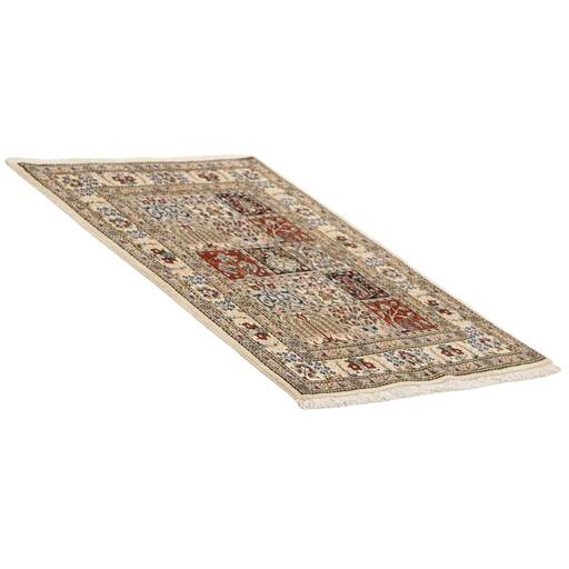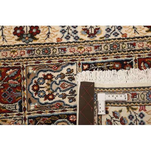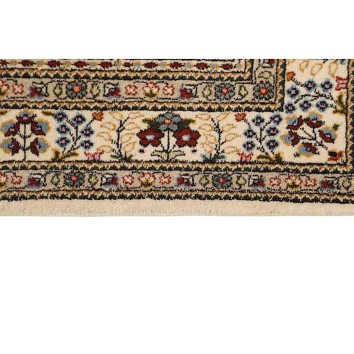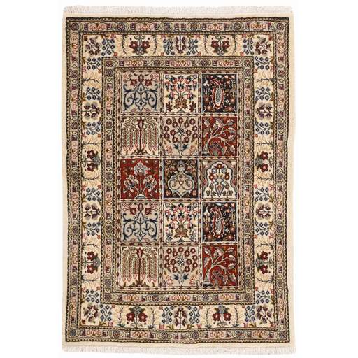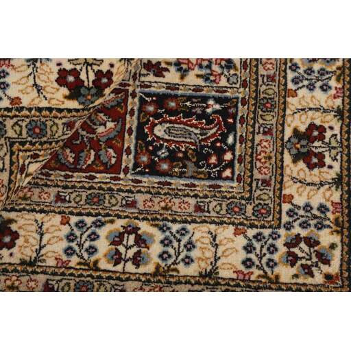 Moud est une petite ville au sud de Mashad, dans la province de Khorrasan. Les tapis de cette région se caractérisent par l'homogénéité de leurs motifs et de leur qualité. La chaîne et la trame sont en coton et le velours en laine. Les bordures sont une version de la bordure persane traditionnelle en tortue. Les tapis sont fabriqués dans toutes les tailles. Les tapis Moud sont souvent copiés en Inde, en raison de leur remarquable homogénéité. Les motifs caractéristiques de Moud sont parmi les plus uniformes, les plus réguliers et les plus facilement reconnaissables de la province de Khorrasan. Les Moud Mahi sont fabriqués dans des tons beige, rouge clair ou bleu, avec des motifs Mahi sur toute la surface ou avec un médaillon en forme d'étoile. Mahi signifie poisson et le motif Mahi est le motif le plus couramment utilisé dans les véritables tapis persans. En l'observant de près, vous pouvez voir un étang entouré de quatre poissons.
