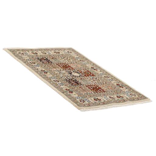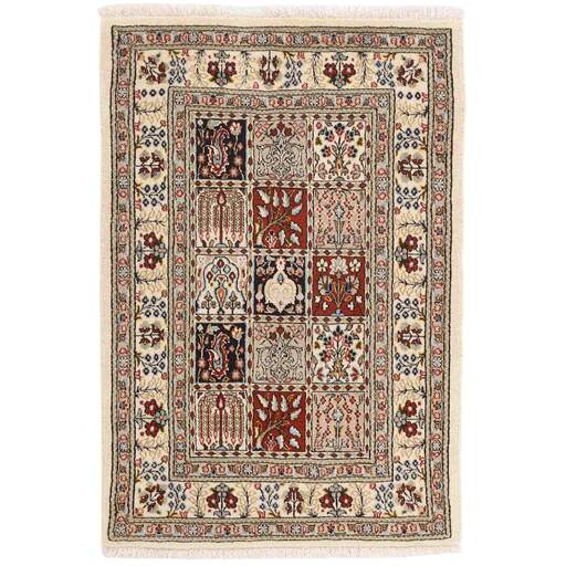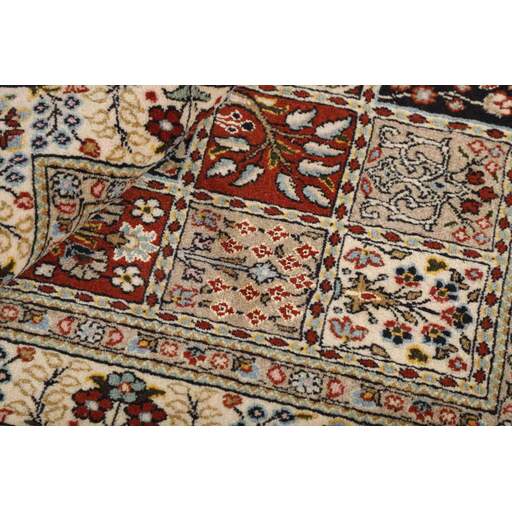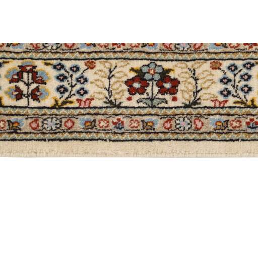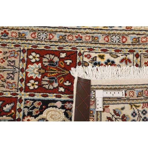 Moud est une petite ville au sud de Mashad, dans la province de Khorrasan. Les tapis de cette région se caractérisent par l'homogénéité de leurs motifs et de leur qualité. La chaîne et la trame sont en coton et le velours en laine. Les bordures sont une version de la bordure persane traditionnelle en tortue. Les tapis sont fabriqués dans toutes les tailles. Les tapis Moud sont souvent copiés en Inde, en raison de leur remarquable homogénéité. Les motifs caractéristiques de Moud sont parmi les plus uniformes, les plus réguliers et les plus facilement reconnaissables de la province de Khorrasan. Les Moud Mahi sont fabriqués dans des tons beige, rouge clair ou bleu, avec des motifs Mahi sur toute la surface ou avec un médaillon en forme d'étoile. Mahi signifie poisson et le motif Mahi est le motif le plus couramment utilisé dans les véritables tapis persans. En l'observant de près, vous pouvez voir un étang entouré de quatre poissons.