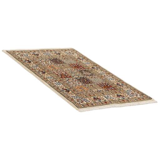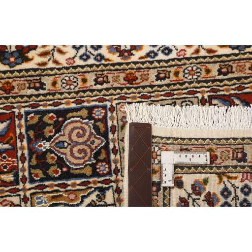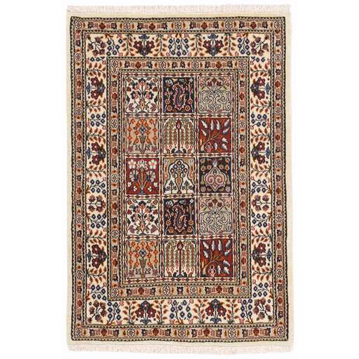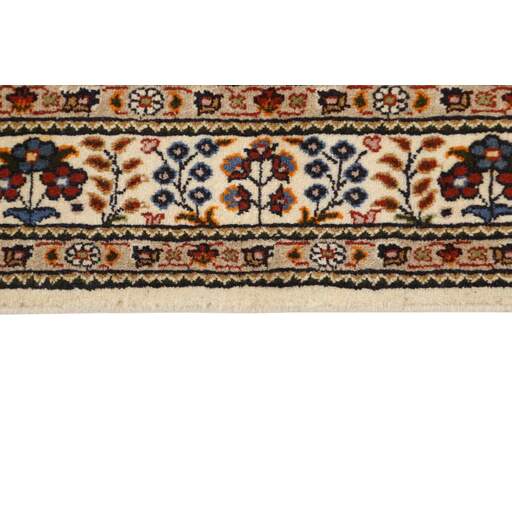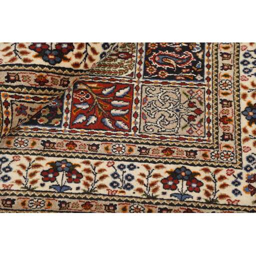 Moud est une petite ville au sud de Mashad, dans la province de Khorrasan. Les tapis de cette région se caractérisent par l'homogénéité de leurs motifs et de leur qualité. La chaîne et la trame sont en coton et le velours en laine. Les bordures sont une version de la bordure persane traditionnelle en tortue. Les tapis sont fabriqués dans toutes les tailles. Les tapis Moud sont souvent copiés en Inde, en raison de leur remarquable homogénéité. Les motifs caractéristiques de Moud sont parmi les plus uniformes, les plus réguliers et les plus facilement reconnaissables de la province de Khorrasan. Les Moud Mahi sont fabriqués dans des tons beige, rouge clair ou bleu, avec des motifs Mahi sur toute la surface ou avec un médaillon en forme d'étoile. Mahi signifie poisson et le motif Mahi est le motif le plus couramment utilisé dans les véritables tapis persans. En l'observant de près, vous pouvez voir un étang entouré de quatre poissons.
